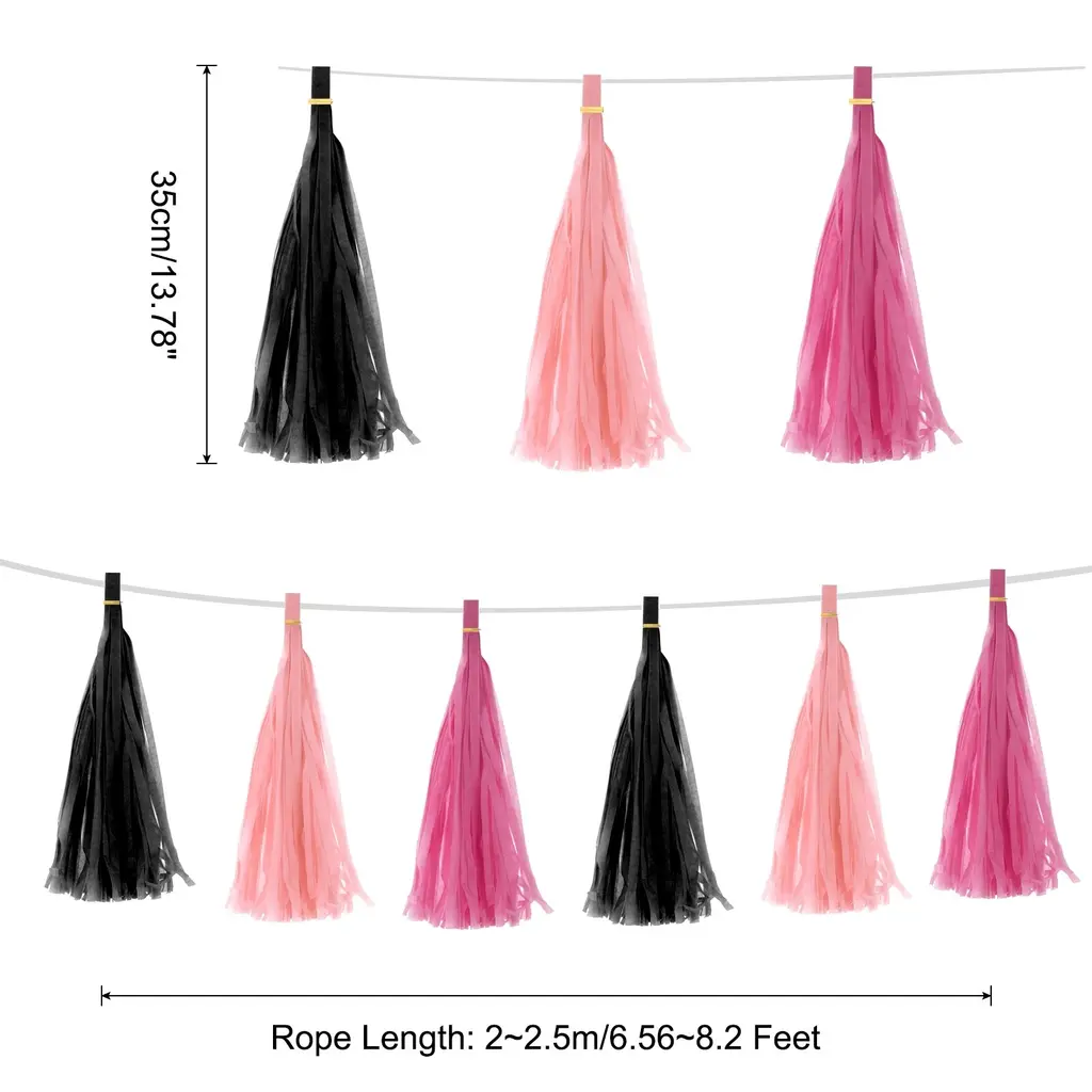 What is this?This tassel garland banner is mainly used for party decoration, you can hang or stick these decorative ribbons on the wall, window, door or shelf to add a different atmosphere to your party, mainly used for birthdays, weddings, Christmas, Easter, masquerade, graduation party and other partiesWhat will I get?Material: PaperColor: Light RedRope Length: 2~2.5m/6.56~8.2 FeetTassel Length:35cm / 13.78 inchPackage content:20 Pcs x Tissue Paper TasselsIs there any advantage of the product?1. This tassel garland banner is made of paper, not easy to break and can be reused. When the party is over, just take it off and fold it back.2. This tissue paper has tassel design, hanging at the party scene, can add a different sense of atmosphere and add a variety of decorations to your party.3. These party tassels are very easy to use, the rope is strong, even if you hang it outdoors, it will not fall off easily, you can hang it on any decorative place you wantHow to use it?String the tassel paper on rope,and hang the ends of the string where you want to decorationWhat should I notice?Tips: please confirm the length before you buy.