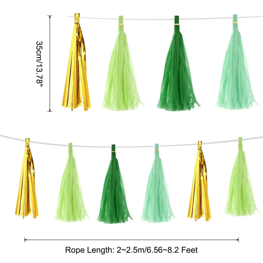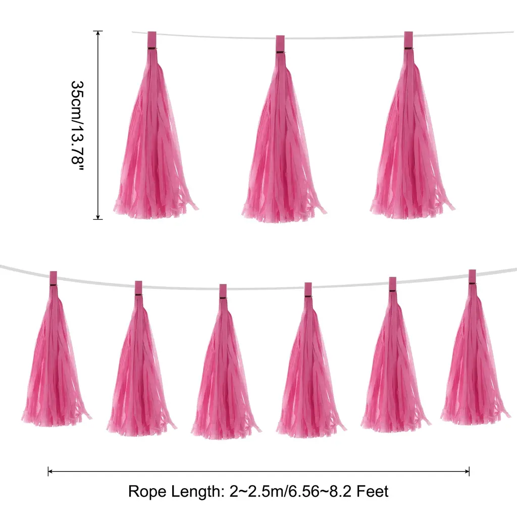 What is this?This tassel garland banner is mainly used for party decoration, you can hang or stick these decorative ribbons on the wall, window, door or shelf to add a different atmosphere to your party, mainly used for birthdays, weddings, Christmas, Easter, masquerade, graduation party and other partiesWhat will I get?Material: PaperColor: Light RedRope Length: 2~2.5m/6.56~8.2 FeetTassel Length:35cm / 13.78 inchPackage content:20 Pcs x Tissue Paper TasselsIs there any advantage of the product?1. This tassel garland banner is made of paper, not easy to break and can be reused. When the party is over, just take it off and fold it back.2. This tissue paper has tassel design, hanging at the party scene, can add a different sense of atmosphere and add a variety of decorations to your party.3. These party tassels are very easy to use, the rope is strong, even if you hang it outdoors, it will not fall off easily, you can hang it on any decorative place you wantHow to use it?String the tassel paper on rope,and hang the ends of the string where you want to decorationWhat should I notice?Tips: please confirm the length before you buy.