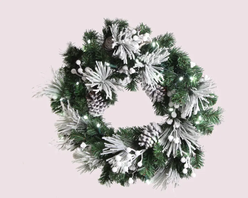 24" Flocked White Garland With White BerriesPart of the White Christmas Collection, our beautiful 24" artificial flocked wreath is decorated with flocked pine cones and picks. The wreath is lit with Pure White 5MM LED lights and artfully crafted for the utmost realism creating an eye-catching appeal you''ll love for years to come.