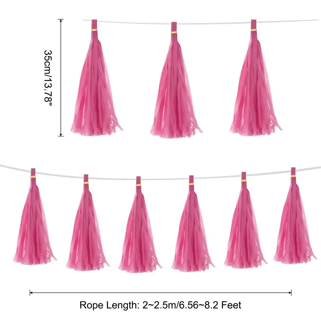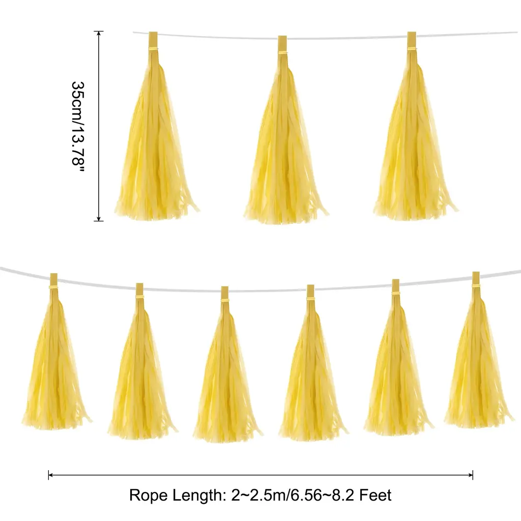 What is this?This tassel garland banner is mainly used for party decoration, you can hang or stick these decorative ribbons on the wall, window, door or shelf to add a different atmosphere to your party, mainly used for birthdays, weddings, Christmas, Easter, masquerade, graduation party and other partiesWhat will I get?Material: PaperColor: OrangeRope Length: 2~2.5m/6.56~8.2 FeetTassel Length:35cm / 13.78 inchPackage content:20 Pcs x Tissue Paper TasselsIs there any advantage of the product?1. This tassel garland banner is made of paper, not easy to break and can be reused. When the party is over, just take it off and fold it back.2. This tissue paper has tassel design, hanging at the party scene, can add a different sense of atmosphere and add a variety of decorations to your party.3. These party tassels are very easy to use, the rope is strong, even if you hang it outdoors, it will not fall off easily, you can hang it on any decorative place you wantHow to use it?String the tassel paper on rope,and hang the ends of the string where you want to decorationWhat should I notice?Tips: please confirm the length before you buy.