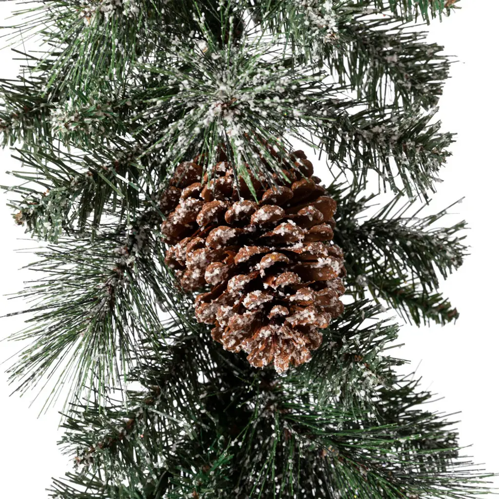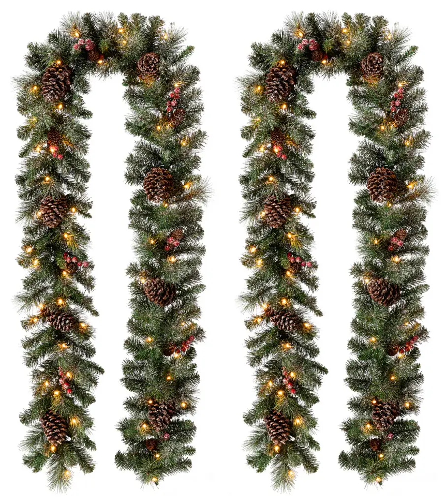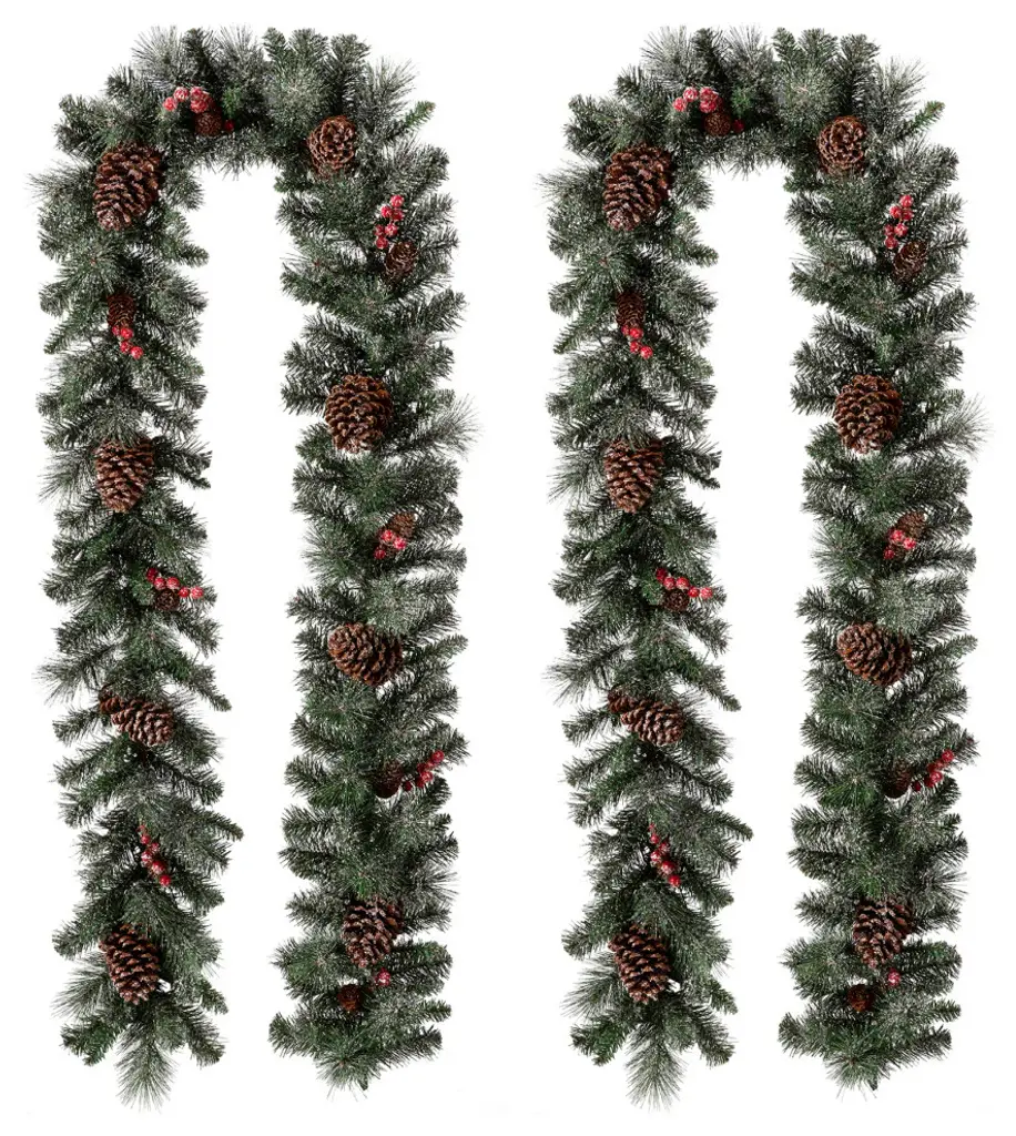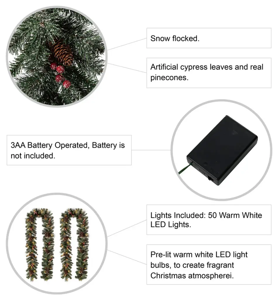 "The 9ft garland provides ample length to easily adorn doors, mantles or banisters, making this versatile decoration ideal for any situation. Each of the 180 tips is modeled to a pine tree''s while the frosted design creates a winter wonderland around your home. Several large pinecones and berry decorations among the needles add an extra holiday touch to this garland. It creating the perfect holiday touch for your home.-Set of 2-Branch Tip Count : 180 (PINE NEEDLE TIPS: 40,PVC TIPS: 140).-Lights Included: 50 Warm White LED Lights. -3AA Battery Operated, Battery is not included.-Indoor or covered outdoor use.Product may ship compressed -You can adjust all the branches with an elegant look like the images."