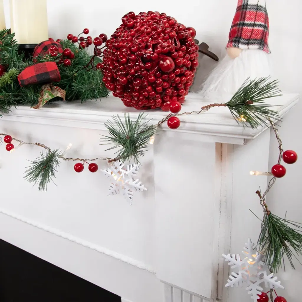This battery-operated pine garland will make your Christmas decorating a breeze. Already decorated with snowflakes and berries for a touch of winter and a pop of color. Drape it over your mantel wrap it around a banister or use it to decorate your tree. Battery-operated means you can place them anywhere. Durable and highly flexible these lights can be displayed quickly and easily for all of your holiday decorating needs. Product Features: Color: warm white bulbs / clear wire. Holly berries pine sprigs and metal snowflakes. Bulb type: LED. Number of bulbs on string: 20. Bulb size: micro. Spacing between each bulb: 4". Lighted length: 6'. 11.75' lead cord. Additional Product Features: LED lights 90% less energy. Bulb stay cool to the touch. Requires 2 'AA' batteries - not included. Convenient on/off switch on battery pack. Covered outdoor area or indoor use recommended. Non-replaceable bulbs
