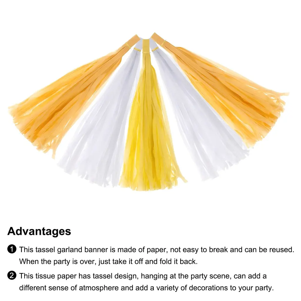 What is this?This tassel garland banner is mainly used for party decoration, you can hang or stick these decorative ribbons on the wall, window, door or shelf to add a different atmosphere to your party, mainly used for birthdays, weddings, Christmas, Easter, masquerade, graduation party and other partiesWhat will I get?Material: PaperColor: Light Yellow,Dark Yellow,WhiteRope Length: 2~2.5m/6.56~8.2 FeetTassel Length:35cm / 13.78 inchPackage content:20 Pcs x Tissue Paper TasselsIs there any advantage of the product?1. This tassel garland banner is made of paper, not easy to break and can be reused. When the party is over, just take it off and fold it back.2. This tissue paper has tassel design, hanging at the party scene, can add a different sense of atmosphere and add a variety of decorations to your party.3. These party tassels are very easy to use, the rope is strong, even if you hang it outdoors, it will not fall off easily, you can hang it on any decorative place you wantHow to use it?String the tassel paper on rope,and hang the ends of the string where you want to decorationWhat should I notice?Tips: please confirm the length before you buy.