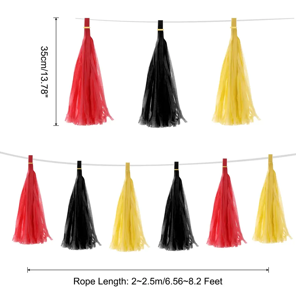 What is this?This tassel garland banner is mainly used for party decoration, you can hang or stick these decorative ribbons on the wall, window, door or shelf to add a different atmosphere to your party, mainly used for birthdays, weddings, Christmas, Easter, masquerade, graduation party and other partiesWhat will I get?Material: PaperColor: Light Yellow,Dark Yellow,WhiteRope Length: 2~2.5m/6.56~8.2 FeetTassel Length:35cm / 13.78 inchPackage content:20 Pcs x Tissue Paper TasselsIs there any advantage of the product?1. This tassel garland banner is made of paper, not easy to break and can be reused. When the party is over, just take it off and fold it back.2. This tissue paper has tassel design, hanging at the party scene, can add a different sense of atmosphere and add a variety of decorations to your party.3. These party tassels are very easy to use, the rope is strong, even if you hang it outdoors, it will not fall off easily, you can hang it on any decorative place you wantHow to use it?String the tassel paper on rope,and hang the ends of the string where you want to decorationWhat should I notice?Tips: please confirm the length before you buy.
