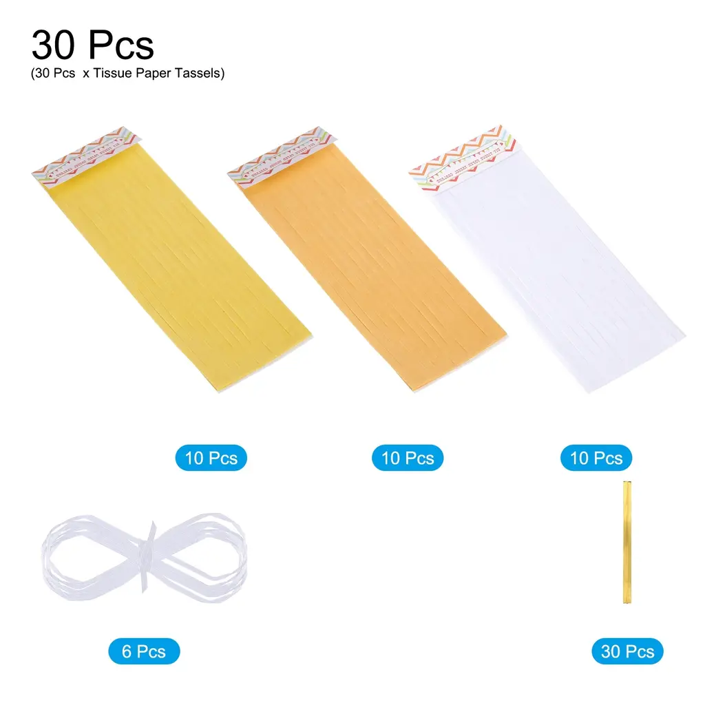 What is this?This tassel garland banner is mainly used for party decoration, you can hang or stick these decorative ribbons on the wall, window, door or shelf to add a different atmosphere to your party, mainly used for birthdays, weddings, Christmas, Easter, masquerade, graduation party and other partiesWhat will I get?Material: PaperColor: Light Yellow,Dark Yellow,WhiteRope Length: 2~2.5m/6.56~8.2 FeetTassel Length:35cm / 13.78 inchPackage content:20 Pcs x Tissue Paper TasselsIs there any advantage of the product?1. This tassel garland banner is made of paper, not easy to break and can be reused. When the party is over, just take it off and fold it back.2. This tissue paper has tassel design, hanging at the party scene, can add a different sense of atmosphere and add a variety of decorations to your party.3. These party tassels are very easy to use, the rope is strong, even if you hang it outdoors, it will not fall off easily, you can hang it on any decorative place you wantHow to use it?String the tassel paper on rope,and hang the ends of the string where you want to decorationWhat should I notice?Tips: please confirm the length before you buy.