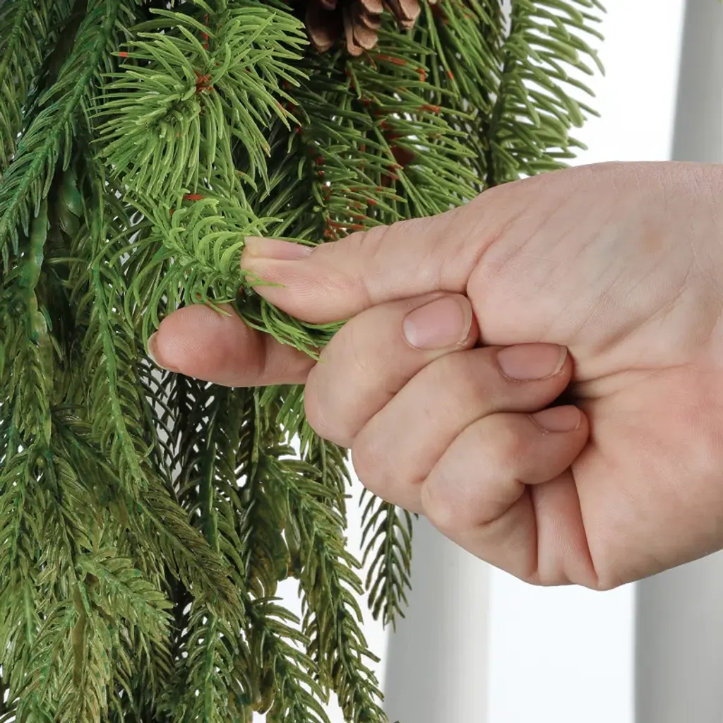 This real touch Norfolk Spruce and Juniper garland has a rustic and realistic look that easily updates your home décor. It's crafted from natural touch plastic branches in shades of organic green in a long shape. Perfect for displaying on tables, mantles and as a centerpiece. We love that the stems are all bendable, so it's ready to arrange however you like as soon as it arrives. Safe for both indoor and outdoor use. Product ships compressed and may require primping to match the images shown. Wipes clean with a damp cloth.