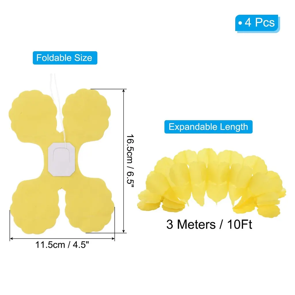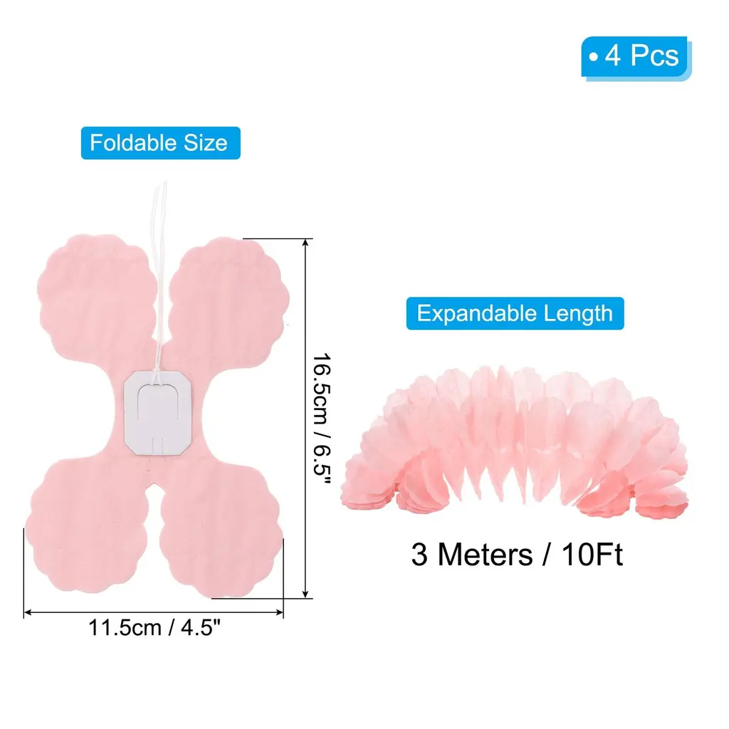 Without losing simplicity and sophistication, our paper garland decorations provide a stylish and artistic decorative project. Widely used at party occasions, such as birthdays, weddings, bridal showers, theme parties, family gatherings, bachelorette parties, engagement parties, new years' parties, Christmas parties, anniversary, graduations, garden decorations, room decor, Easter basket stuffer, etc.SpecificationMaterial: PaperShape: Four-LeafColor: RedEach Folded Size: 16.5 x 11.5 cm/ 0.54 x 0.38inch (LxW)Each Unfolded Length: 3Meters/10FtPackage List: 4Pcs x Tissue Paper GarlandAdvantageOur paper garland is made of quality paper, with a foldable design, can be reusable and easily stored. The connection points are designed to be strong and not easy to break for durable use. Easy to hang, slightly pull the rope on both sides of the garland, you can hang it anywhere you want to decorate. Distinctive design of our paper garland makes decorations more stand to add party atmosphere.InstructionHang the paper garland from the ceiling, wall, window, door, or branch to create a cheerful party atmosphere. Also, you can DIY them according to your imagination, creating unique handicrafts.NOTEPlease do not be rough when using it and avoid contacting the paper garlands with water.