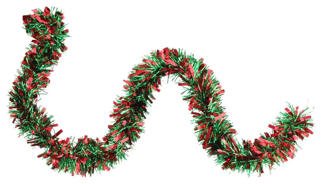 Perfect for decorating Christmas trees, doorways, windows or staircases Color: red and green Unlit Thick cut Flame retardant Tarnish resistant 6 ply garland Dimensions: 50'' long x 4" wide Material(s): tinsel