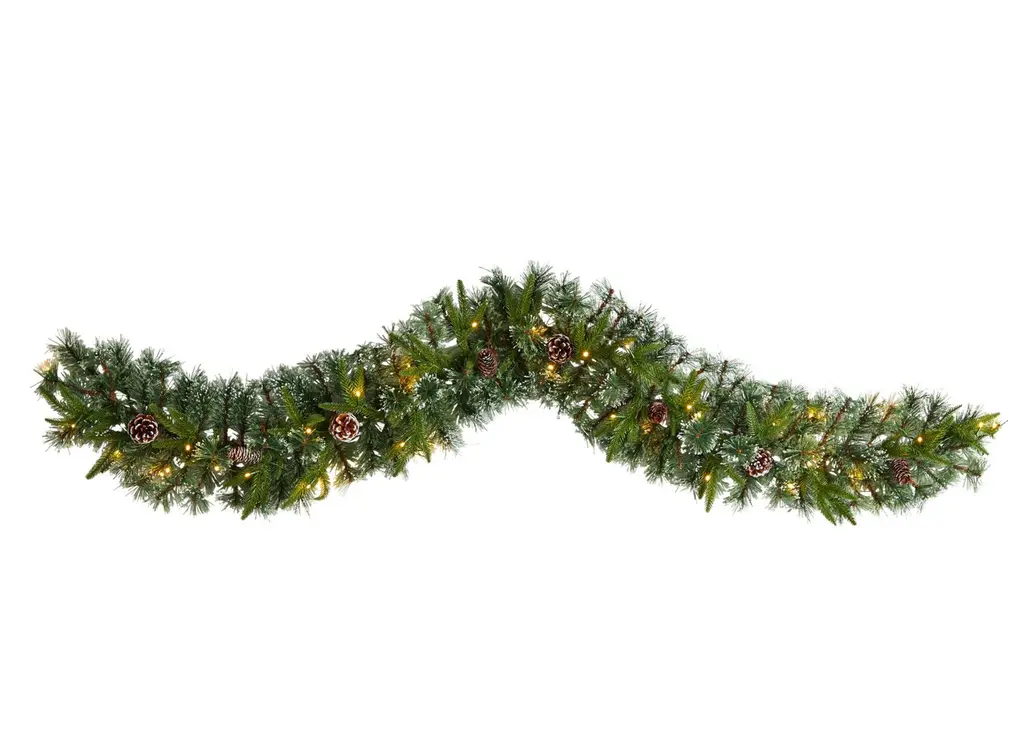 6' Flocked Christmas Garland With 50 White Warm Led Lights And Pine Cones