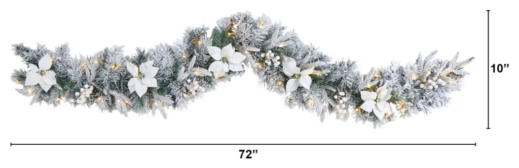 Complete your own winter-inspired wonderland this holiday with the help of this artificial winter garland, intricately designed from realistic looking evergreens with 176 branches for easy styling, all beautifully dusted in a thick coating of faux snow to evoke the ultimate winterscape. This faux garland also comes with 50 LED lights. Great for showcasing over a mantle, bare counter, or stair banister, this impressive 9 long artificial garland will undoubtedly complete a traditional holiday setting for years to come. 6 Flocked Poinsettia and Berry Artificial Christmas Garland with 50 Warm White LED Lights