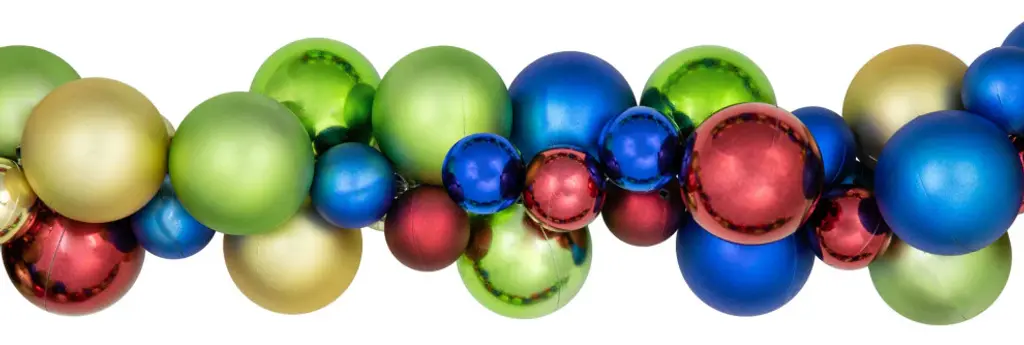 Update your Christmas decor this season with this 2-finish shatterproof ball garland. Designed with shiny and matte ball ornaments for added depth. Shatterproof ornaments combine the beauty and luster of real glass with the unbreakable practicality of plastic. Perfect for mantles railings or as part of your holiday table centerpiece. Product Features: Shatterproof ball Christmas garland Shiny and matte green blue red burgundy silver and gold ball ornaments Clear plastic loops on each end for easy hanging Recommended or indoor use only Dimensions: 72" long Ball diameter: 2" and 1.25" Material(s): plastic