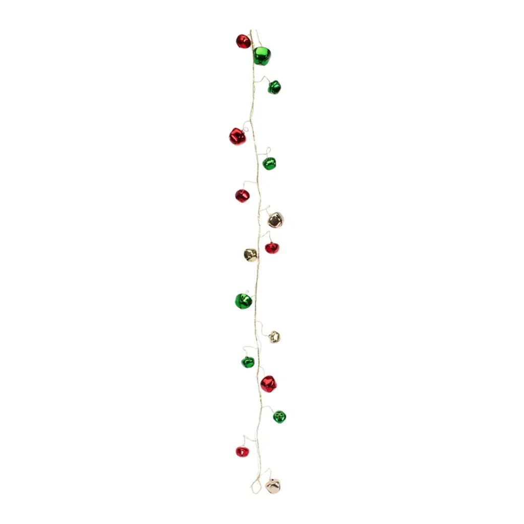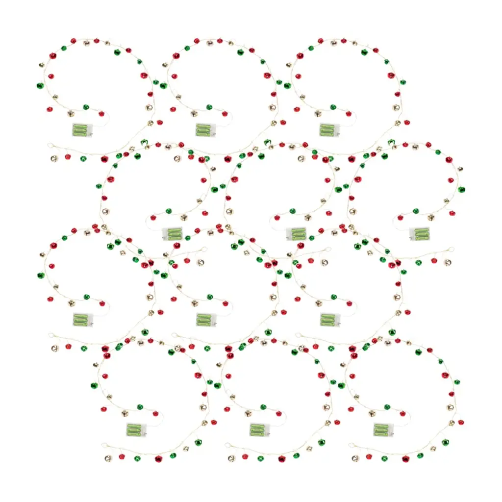 Ring in the holiday season with this festive set of LED Sleigh Bell Garlands. Featuring twelve pieces, this set's traditional red, green, and silver color scheme paired with the rustic bell design makes it a great addition to your Christmas home dcor. The garland measures 5ft long and includes 30 lighted bells. Display the peices on your Christmas tree, stairway railing, or as a table centerpiece to make a statement. Requires 3 AA batteries (not included).