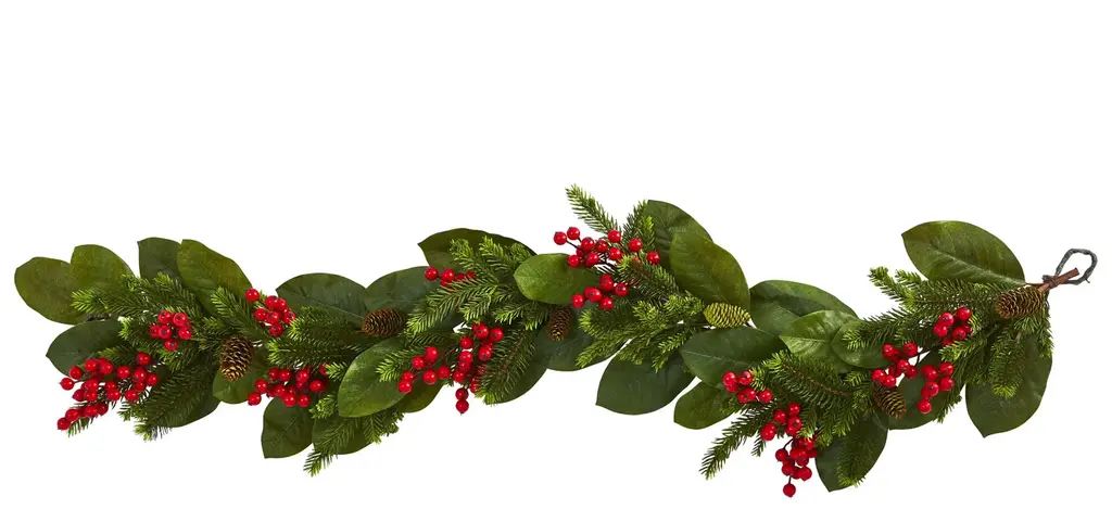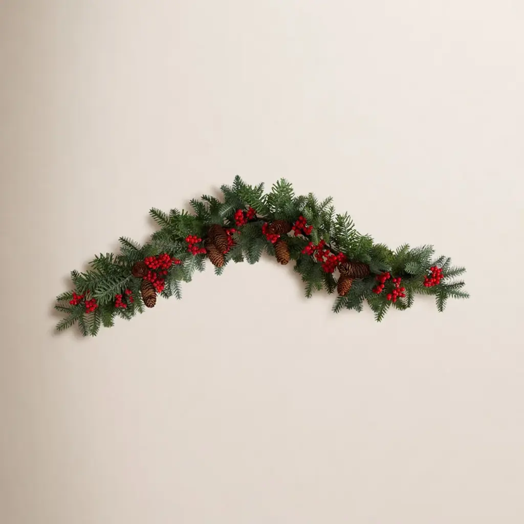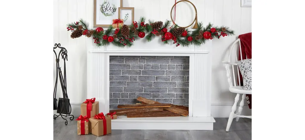 Complete your holiday decor with this artificial winter garland, designed from realistic looking pine foliage in seasonal evergreens, handsomely accented with faux pinecones, red apples and sprays of holly berries - all to evoke the Christmas spirit. Reaching 6' long to make decorating stress-free, this artificial garland is great for mantles, counters, or banisters, and would undoubtedly complete a traditional holiday setting for years to come.