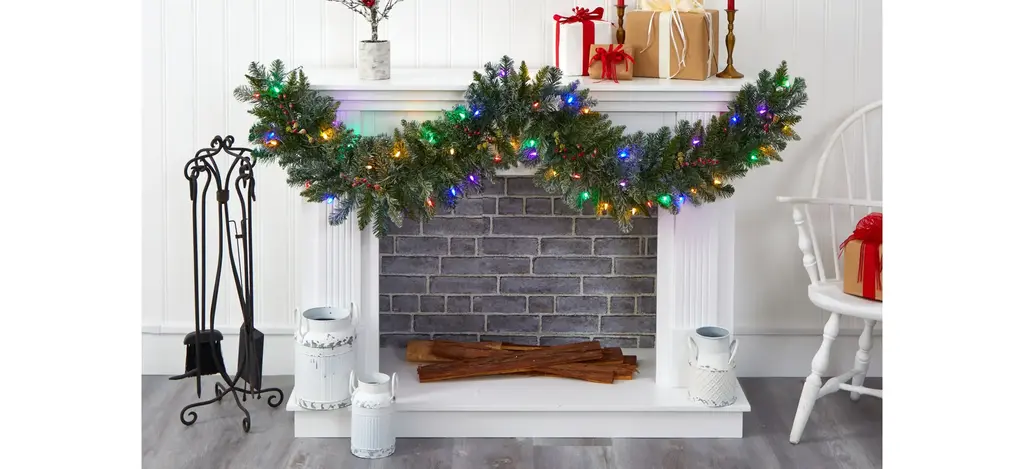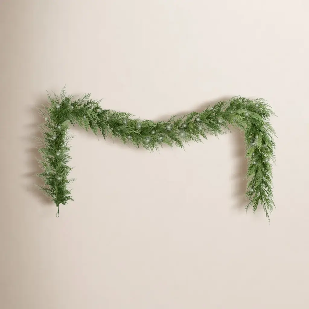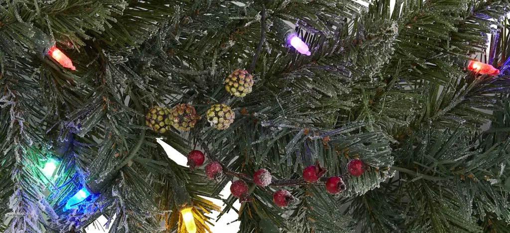 Complete a winter-inspired Christmas setting this holiday with the help of this flocked artificial winter garland, intricately designed from realistic looking evergreens (130 bendable tips) to convey a lifelike appearance, accented throughout with faux holly berries and completely flocked in a palette of winter-white to evoke freshly fallen snow. Arriving pre-strung with 50 multicolored LED lights to add a soft, holiday glow to horizontal surfaces, this 6' long artificial garland will undoubtedly complete a traditional holiday setting for years to come.
