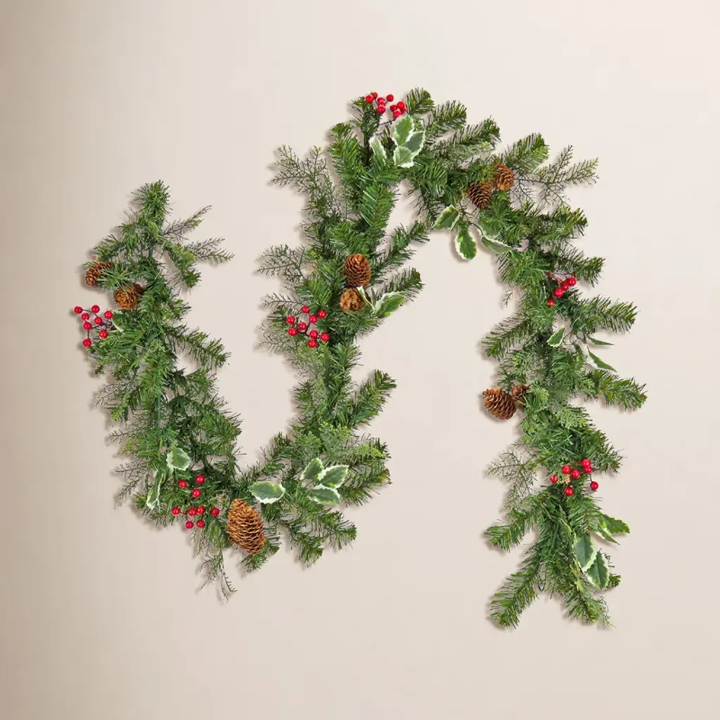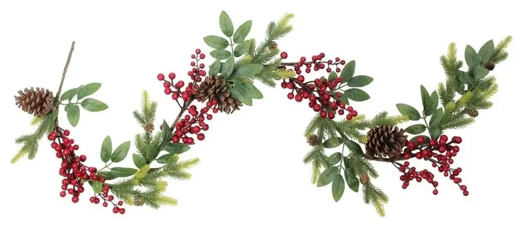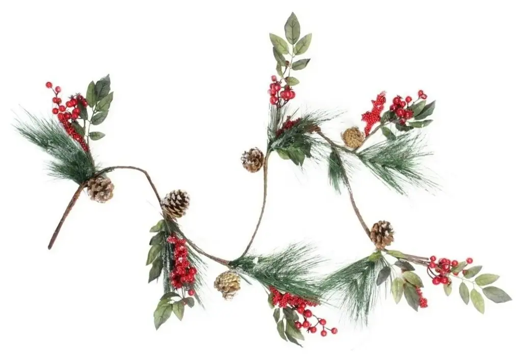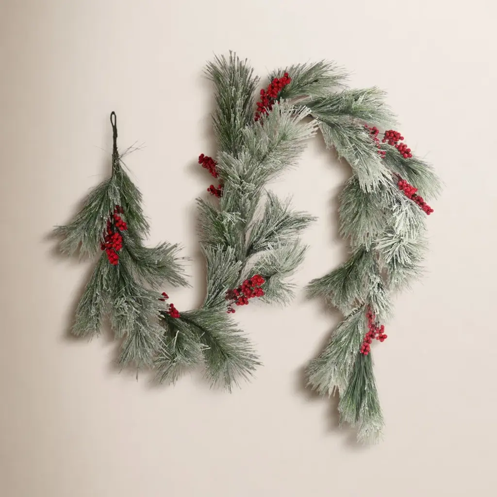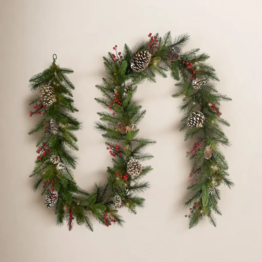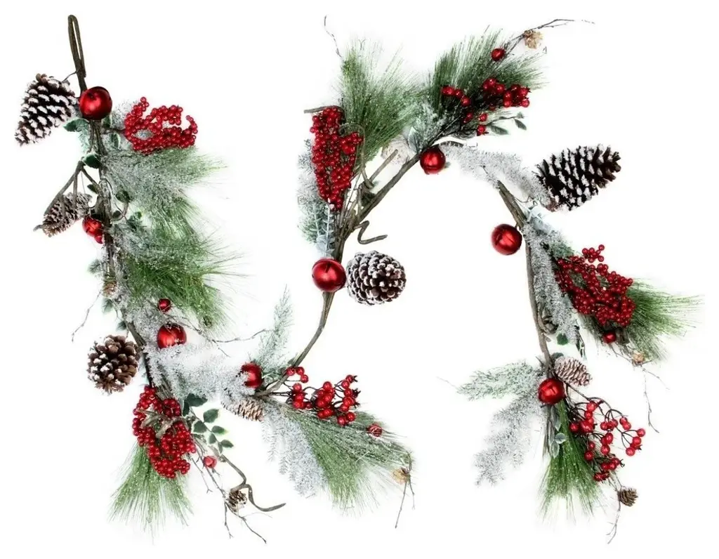 Bursting with bright candy apple red berries and jingle bells pine cones and greenery and then softly frosted this garland will bring vibrant color to your autumn winter and Christmas decorThis festive garland will fill your home with the joys and comforts of the holidaysProduct Features:For indoor use only (or covered outdoors not exposed to the elements)Ready to hang with one attached hangerDimensions: 70"L x 7"W (measured from outermost tip to tip side to side and top to bottom)Material(s): Plastic/pine cones/foam/steel
