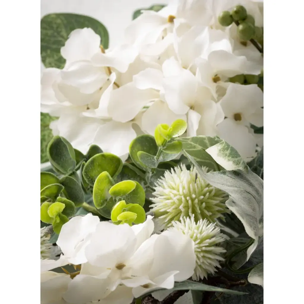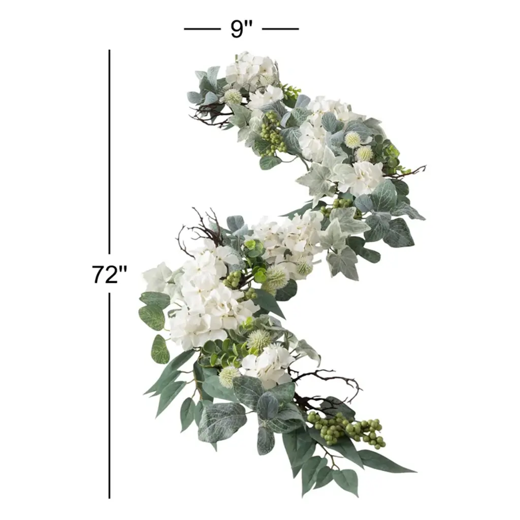 Spruce up your space with a fresh hint of green with this faux hydrangea garland, perfect for bringing a touch of nature indoors. This artificial garland, measuring 72'' in length, resonates with the soft beauty of delicate hydrangeas. It's crafted from polyester in hues of green, white, and brown and is intended for both indoor and sheltered outdoor areas. Plus, it's a great accessory for special occasions like weddings and baby showers. No need for green thumbs or fancy lighting, just hang it up and let the compliments roll in.