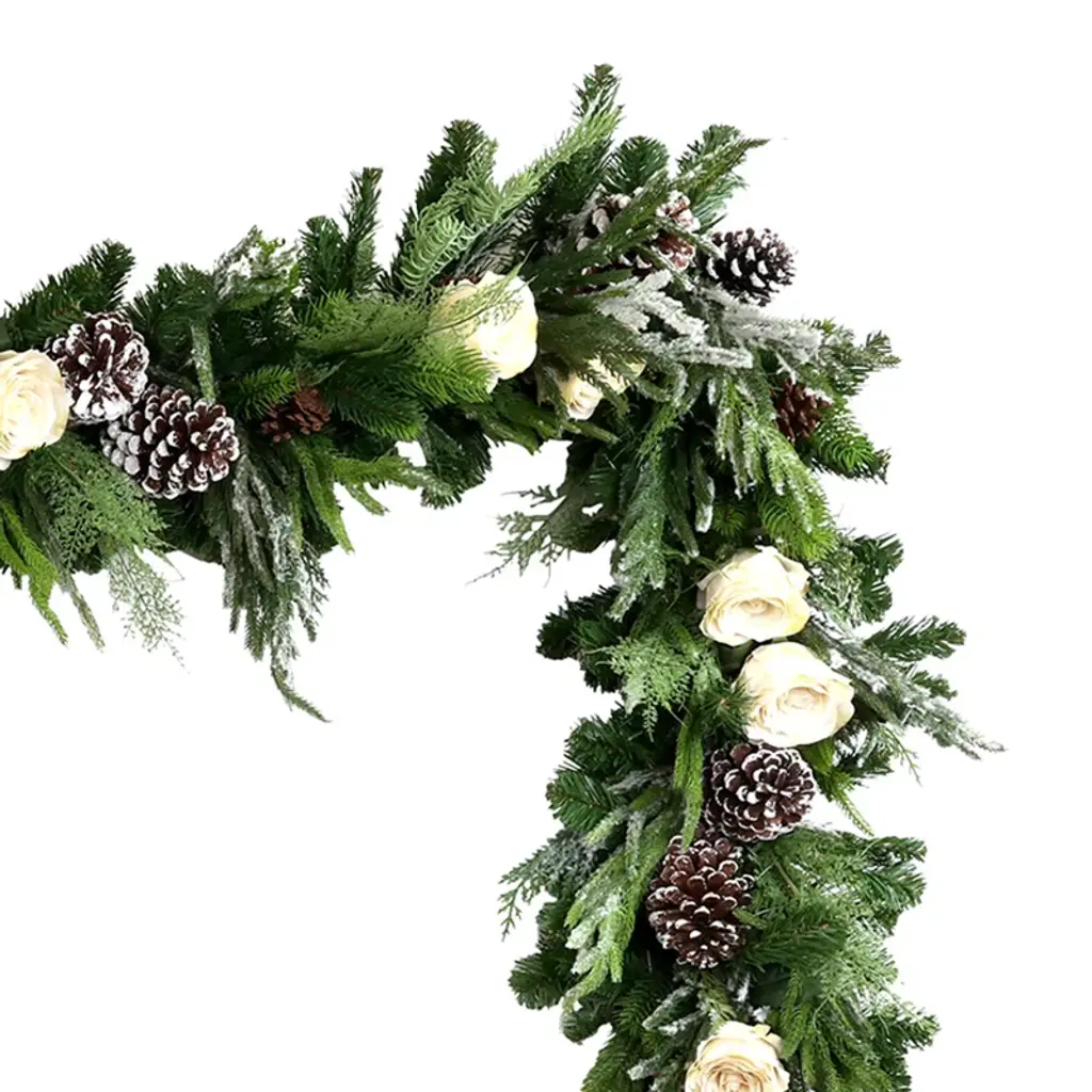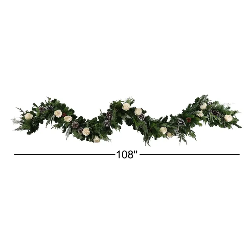 9' Holiday Garland With Roses, Flocked Pine, Ferns And Pinecones