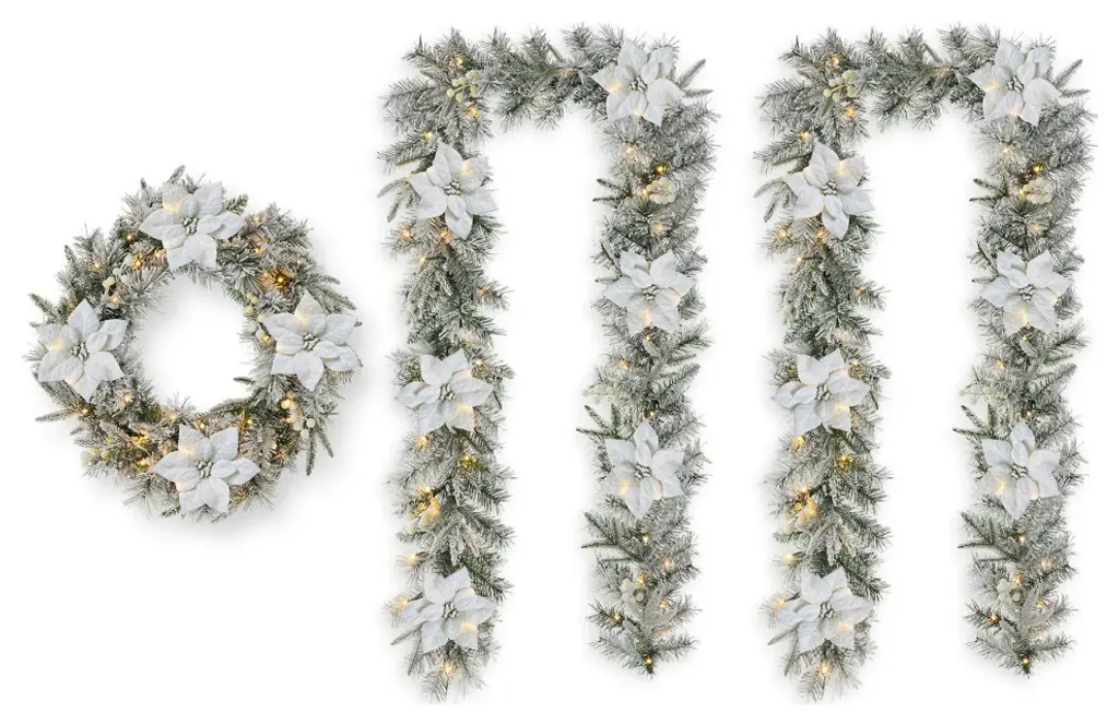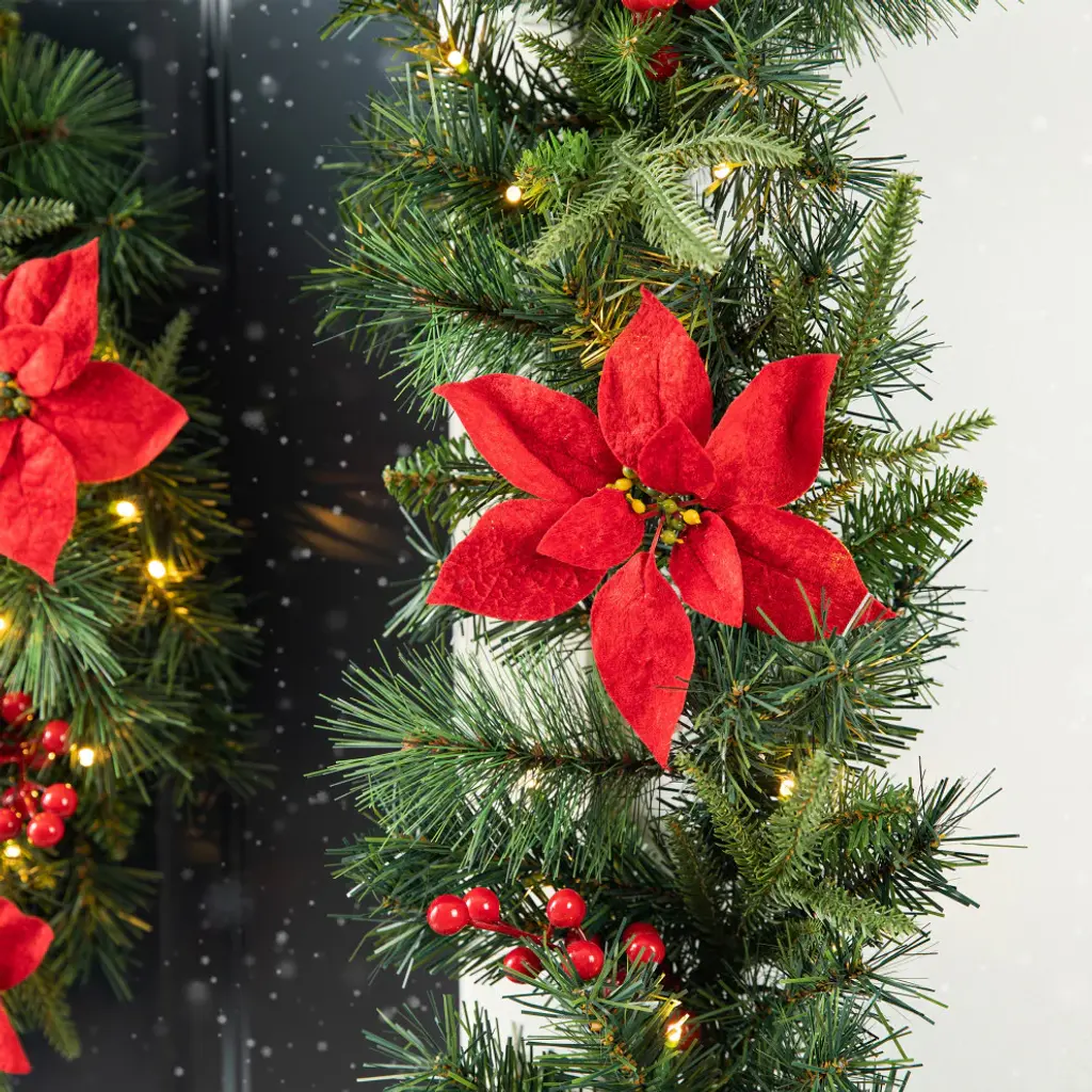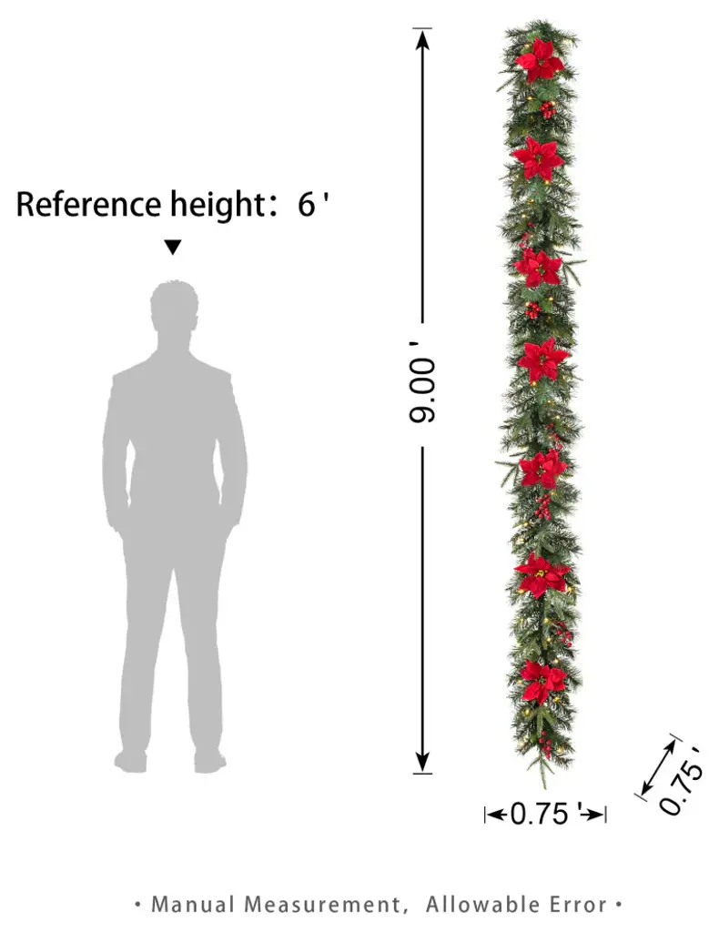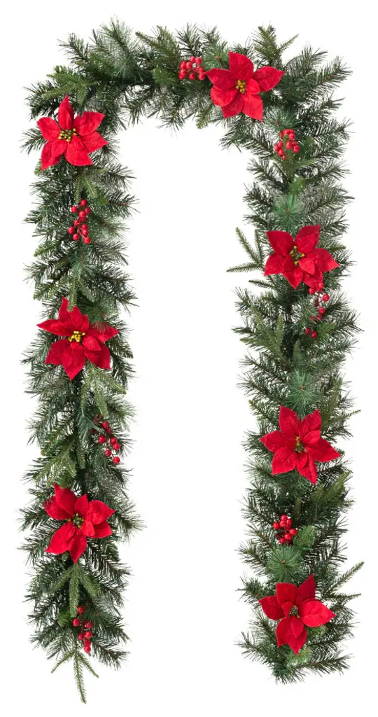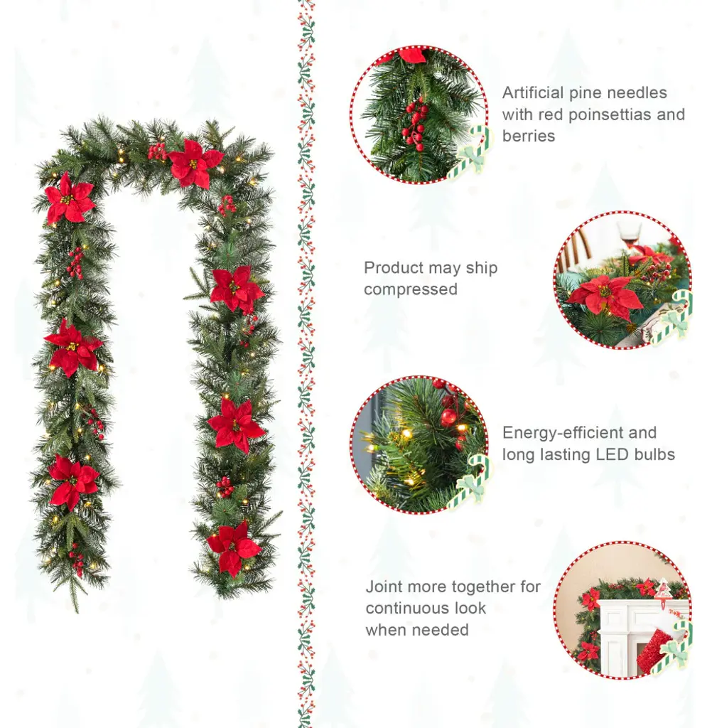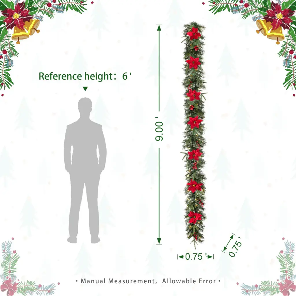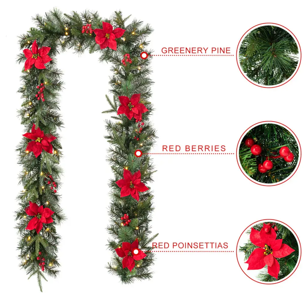 "The 9ft Greenery mixed tips pine garland provides ample length to easily adorn doors, mantles or banisters, making this versatile decoration ideal for any situation. Each of the 230 tips is modeled to a pine tree"™s while the frosted design creates a winter wonderland around your home. Red poinsettias and berries among the needles add an extra holiday touch to this garland. It''s creating the perfect holiday touch for your home. Product may ship compressed -You can adjust all the branches with an elegant look like the images.1. Pre-lit warm white LED light bulbs, choose the steady or twinkle functions, to create warm Christmas atmosphere2. Branch Tip Count : 230, Poinsettias: 7 ,Red Berries: 7 Cluster,12PCS/Cluster, 70 Warm White LED Lights, 3AA Battery Operated, Battery is not included3. Artificial pine needles with red poinsettias and berries in rhythmic arrayed4. Fluff and shape greenery after unpacking5. Wipe clean with a soft, dry cloth or duster6. Energy-efficient and long lasting LED bulbs, On/Off Timer with 6 hours on and 18 hours off brings you convenient.7. Each piece comes with 9ft, joint more together for continuous look when needed, fits beautifully for any space."