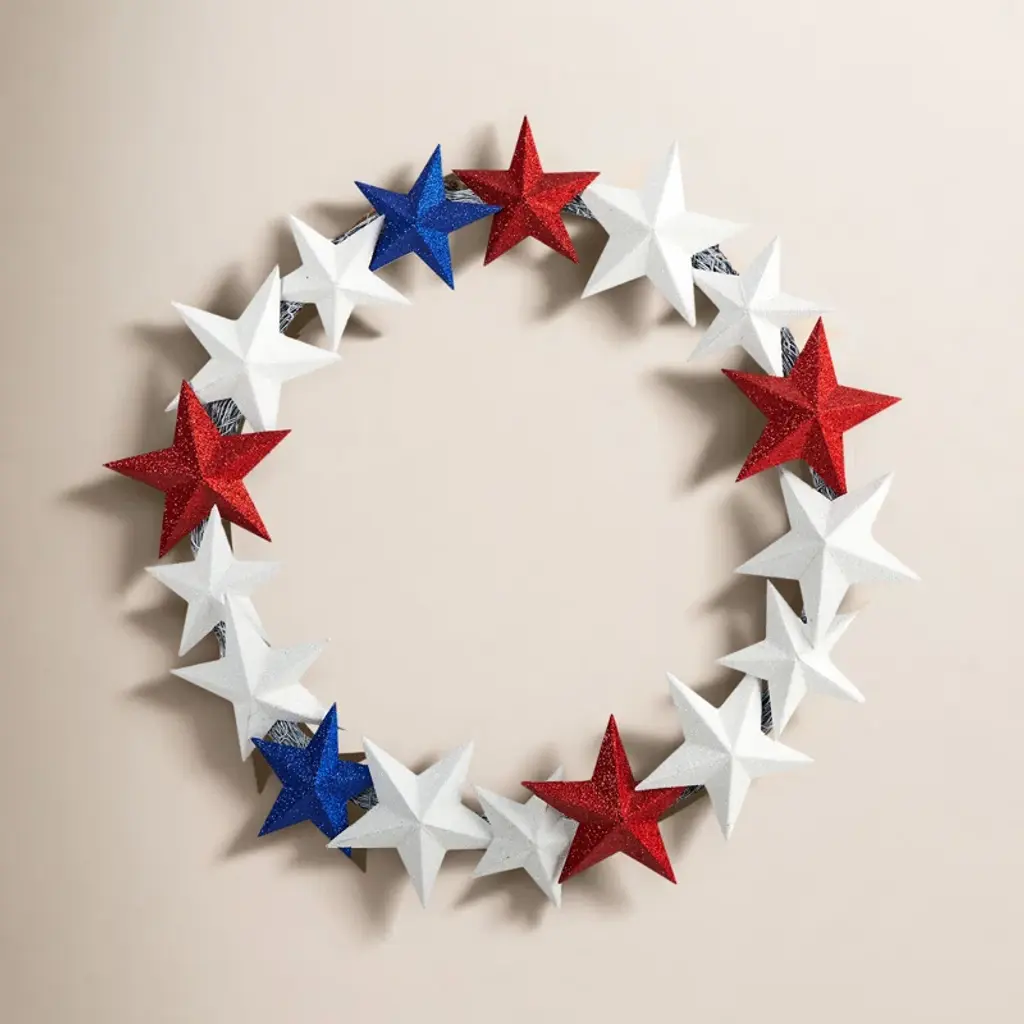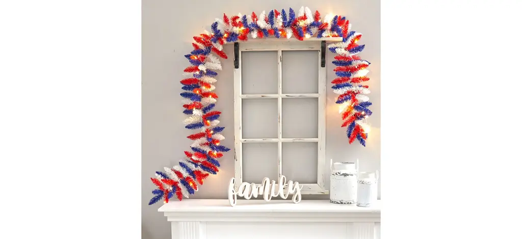 Spark like it's the 4th of July with this Patriotic American Flag Themed Artificial Garland with 50 Warm LED Lights. Put your patriotism on full display by showcasing the red, white, and blue in any space while paying respect to the brave men and women of the armed forces. Nestled in between the bendable branches are LED lights that'll bring the fireworks home. 9' in length, this is the perfect accent for a summer party, Veterans Day or Memorial Day. Battery operated.