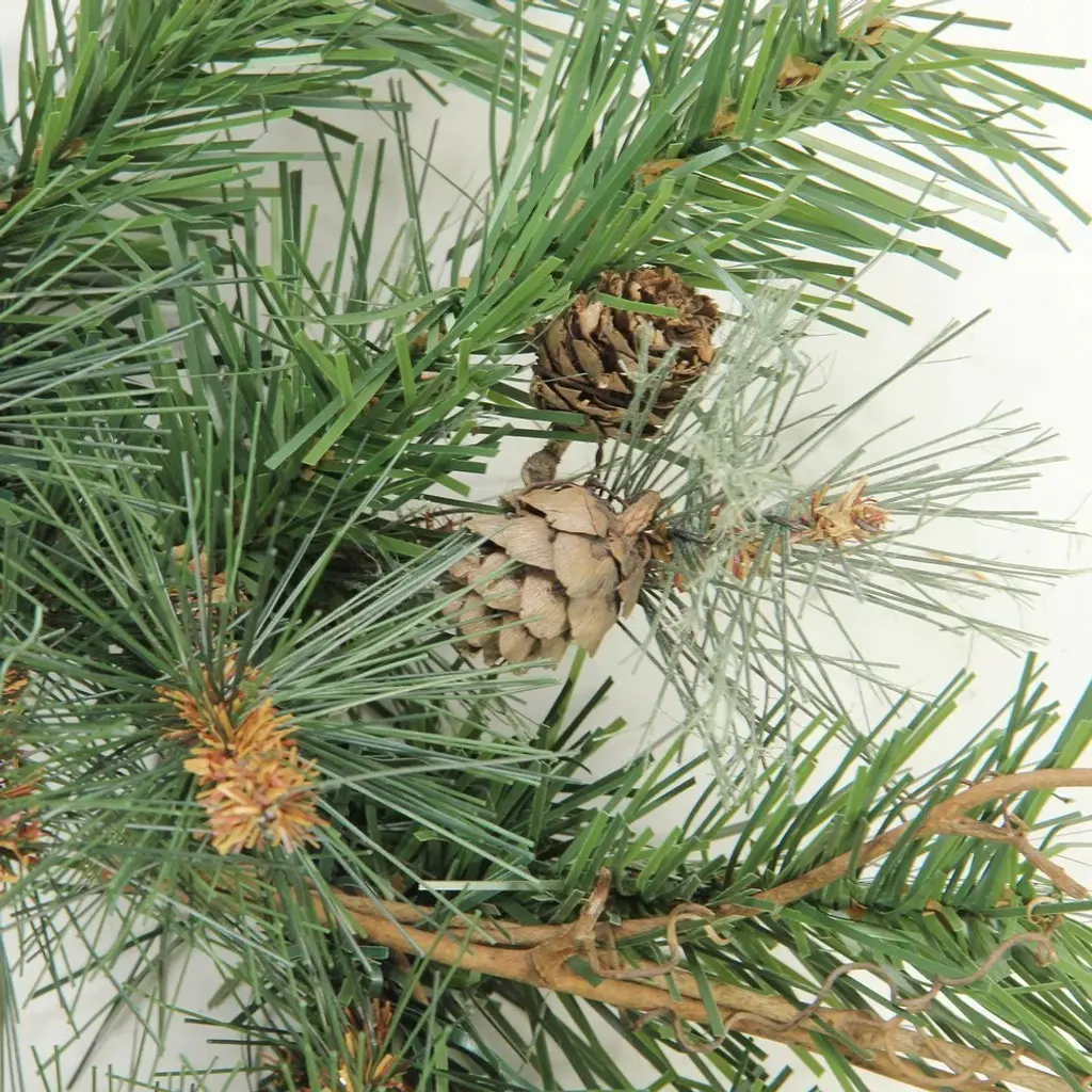 Light green cashmere bottle brush needles add a rustic flare mixed with darker green 2-tone bottle brush needles and tapered PVC tipsAccented with baby pine cones and grapevine throughout for a warm country feelProduct Features:Unlit200 tipsFor indoor use onlyBendable wire center allows for you to shape the garland any way you desireMetal hooks on each end for easy hangingDimensions: 9'' long x 12" wideMaterial(s): PVC/metal/pine cones/grapevine