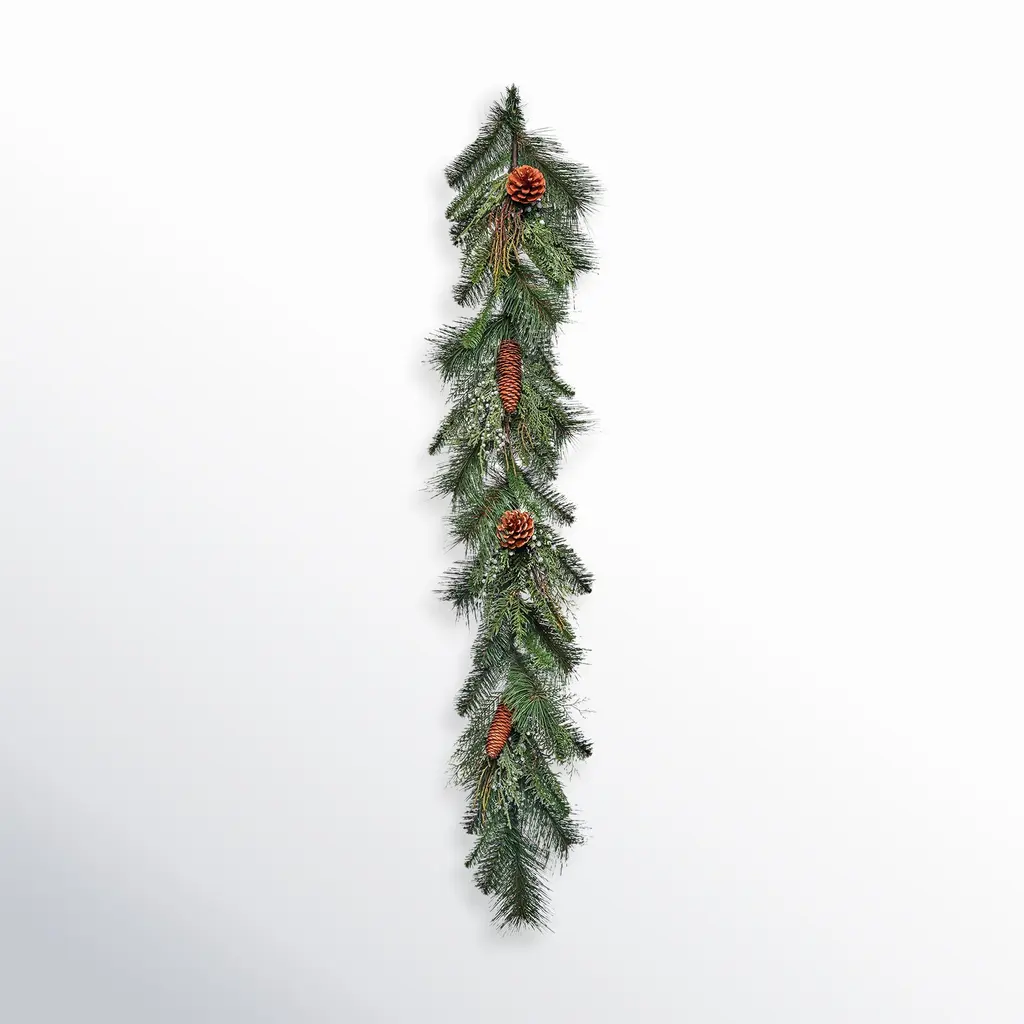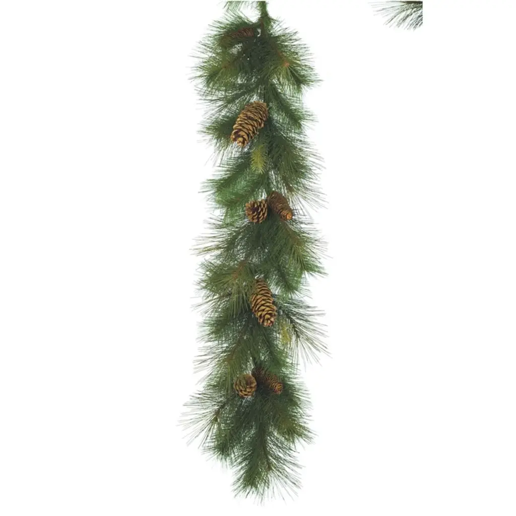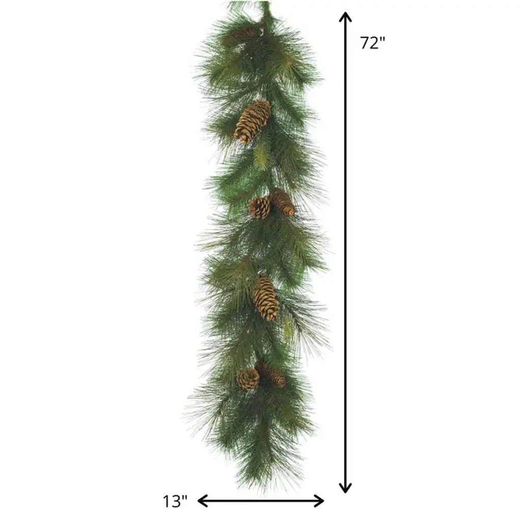Create a cozy, woodsy atmosphere with this incredibly realistic long-needle sugar pine garland. Designed with lifelike PVC greenery and accented by natural-looking pinecones, this garland adds rich texture and depth to your seasonal décor. Measuring 72'' long, it’s perfect for draping along a banister, framing a fireplace mantel, or adding a rustic touch to a holiday tablescape. Crafted for indoor use, this durable and lush piece captures the untamed beauty of the wilderness — no hiking required.