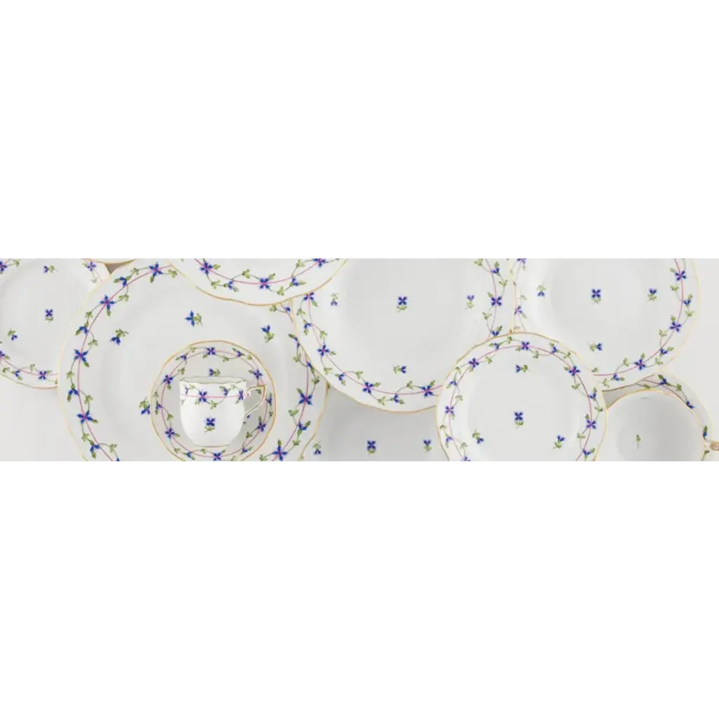 This design of a garland of bright blue cornflowers was introduced in 1890 by Jeno Farkashazy, grandson of the founder of Herend. The apparent French influence reflects the country where young Farkashazy was educated. Hand painted in Hungary. Now the biggest porcelain manufactory in Europe, Herend was founded in 1826 to produce earthenware in the small Hungarian village for which it was named. At the time, Hungary was flooded with low-cost pottery, but in 1839, Mor Fischer became the Manufactory’s new owner and he decided to focus on producing dinnerware replacement pieces for Europe’s royal families to complement their valuable porcelain patterns from Germany and the Far East. As his client base grew, Fischer commissioned his artists to begin designing dinnerware patterns of their own. Queen Victoria’s 1851 purchase of a large set for Windsor Castle was a milestone, setting the stage for aristocrats throughout Europe to clamor for Herend in their estates. In the 1850s, Herend added meticulously-crafted figurines to its creations. Herend’s trademark fishnet pattern, which is widely recognized and prized as Herend’s signature design, started in 1858 when an artist who was intrigued with a Chinese plate’s fish scale design painted it onto a rooster figurine to imitate feathers.
