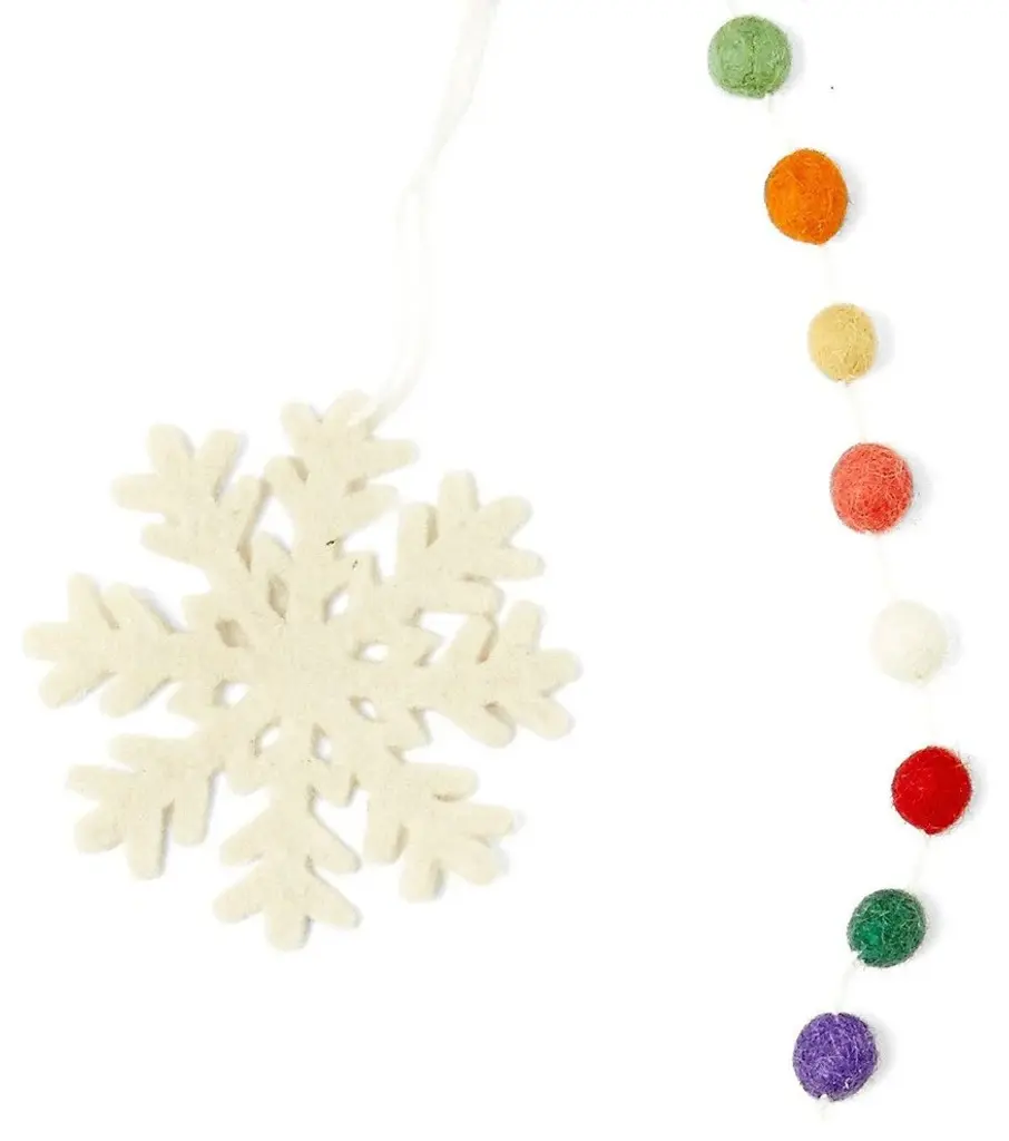 Bright, colorful, little dots wind around your tree like a string of candy gumballs. Large white snowflakes add the traditional wintry notes. Sugar-free. Hand felted wool, 6 ft.Arcadia Home felt designs are hand-felted, hand appliqued, and lovingly created from 100% sustainable wool by artisans working in India. The facility where these pieces are produced is an award-winning model of sustainability, which runs on solar electricity, collects rainwater, and recycles water on-site. By collaborating with this artisan group, Arcadia Home is helping to preserve the tradition of felt making in the area, promote eco-friendly business, and provide fair and safe employment for hundreds of artisan felt-makers, sheepherders, and seamstresses. By purchasing this design, you are joining our efforts to support artisans worldwide. As handmade pieces, each Arcadia Home design is as unique as the artisan who created it.