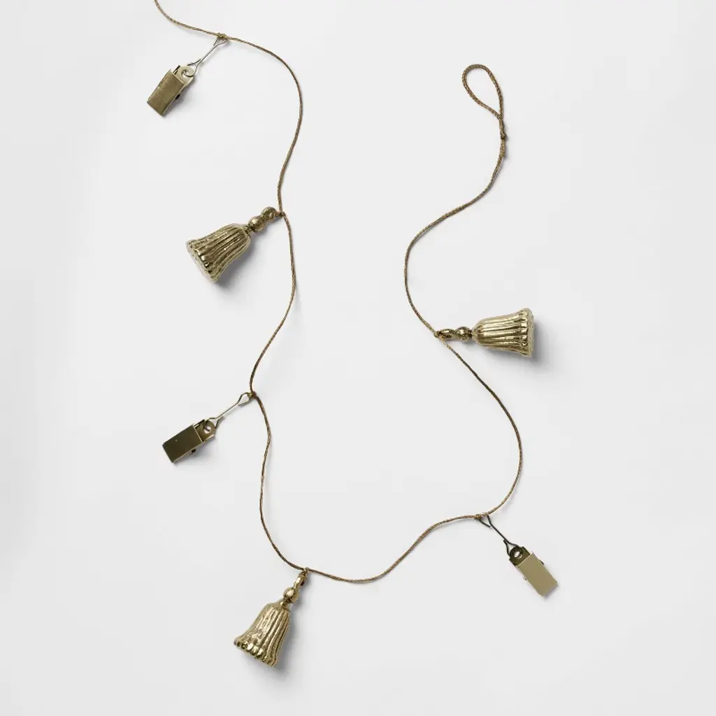 Display your holiday cards with sophisticated style using this 70-Inch Holiday Card Holder Tassel Garland from Threshold™ designed with Studio McGee. This shiny metal garland is adorned with decorative tassels featuring sculptural detailing hanging from the coordinating cord, alternating with convenient hanging clips, all in a gleaming brass finish. Featuring loops at the ends for easy hanging, this versatile garland is perfect for creating a personalized seasonal decor piece that transforms mantels, doorways, or walls into artful displays of holiday cheer.Threshold™ designed with Studio McGee: Looks like home, feels like you.