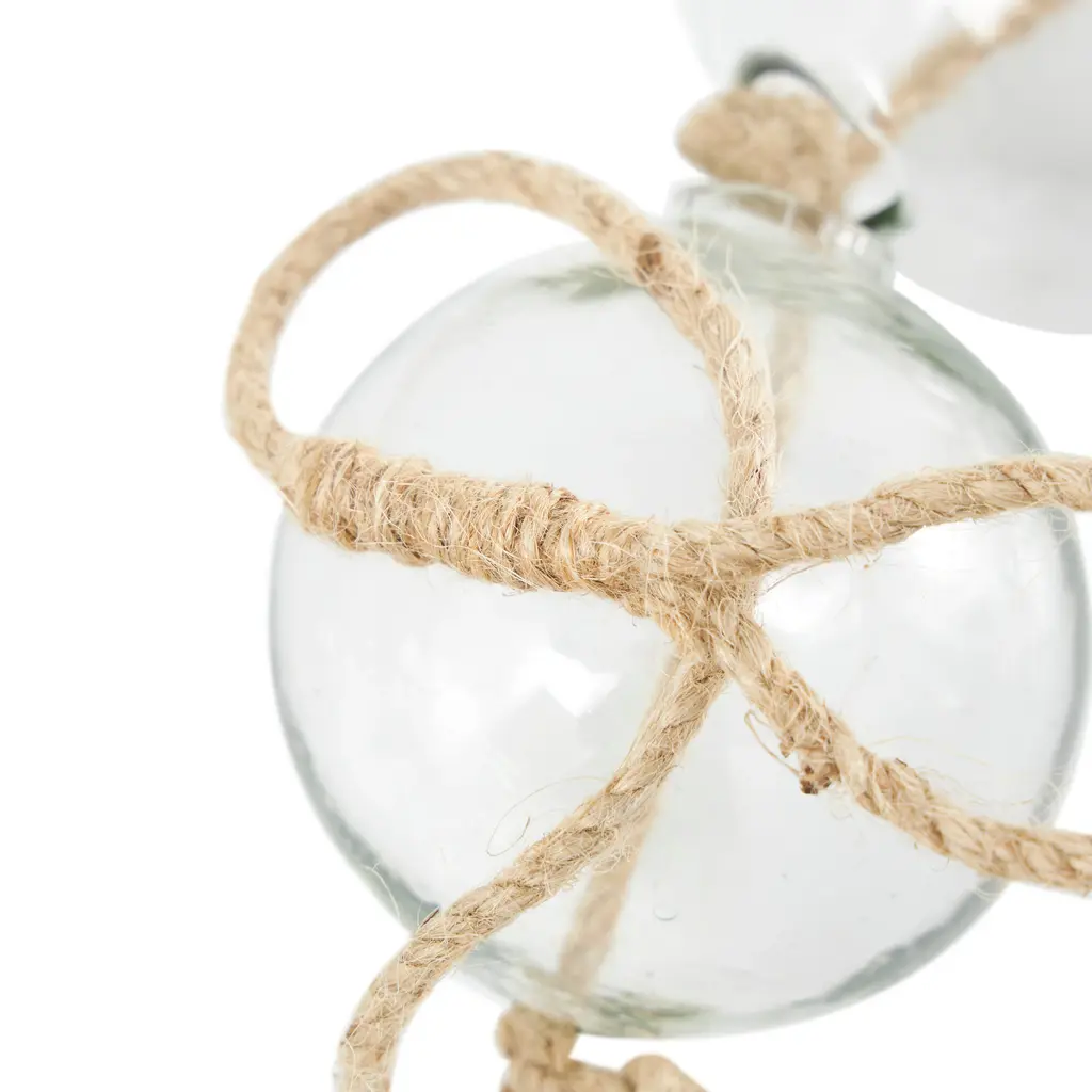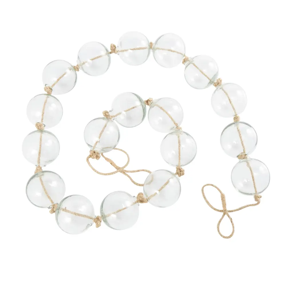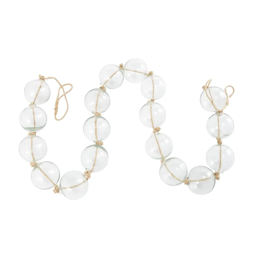A warm and welcoming way to elevate the look of your tablescape and complement your existing decor. Give your surface space a finishing touch with these beautifully crafted decorative garland. Style this clear glass garland draped across a mantle, console, or staircase, or feature it as a centerpiece in a large bowl to create a stunning visual impact and bring texture and dimension to the home. This item ships in 1 carton. This modern glass orb garland can be used year-round or for special occasions, serving as a captivating festive decoration. Glass garland with tassel makes a great gift for any occasion. Due to the handmade nature of these, there will be slight color, shape, and size variations, as well as loose fibers. Suitable for indoor use only. This item ships fully assembled in one piece. Made in India. This is a single clear colored large beads with tassel. Coastal style.