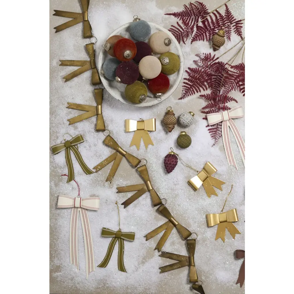 Classic bows with a brassy, vintage inspired finish make the Collectors Garland an heirloom decorative style to bring out for the holidays year after year. Oxidized sheet metal is formed into dimensional, perfectly tied bows that are linked together with small jump rings. Layer multiple strands of this 72-inch-long garland around the Christmas tree, or layer in with fresh greenery on the mantle for a timeless holiday look.