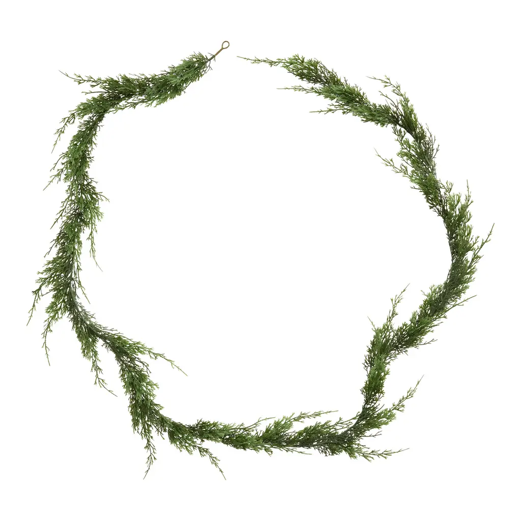 A verdant arrangement of mixed faux-pine sprigs in realistic shades of green, this handmade 9-foot holiday garland is lush, naturalistic, and exceptionally long! It offers three extra feet of length to wrap around bannisters, use to frame windows or doorways, and decorate with our diverse array of wreaths, ornaments and floral stems. Connectable at both ends, the transformative beauty of this garland is revealed in linked pairs and multiples.