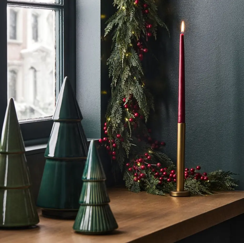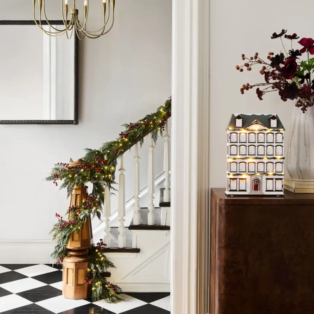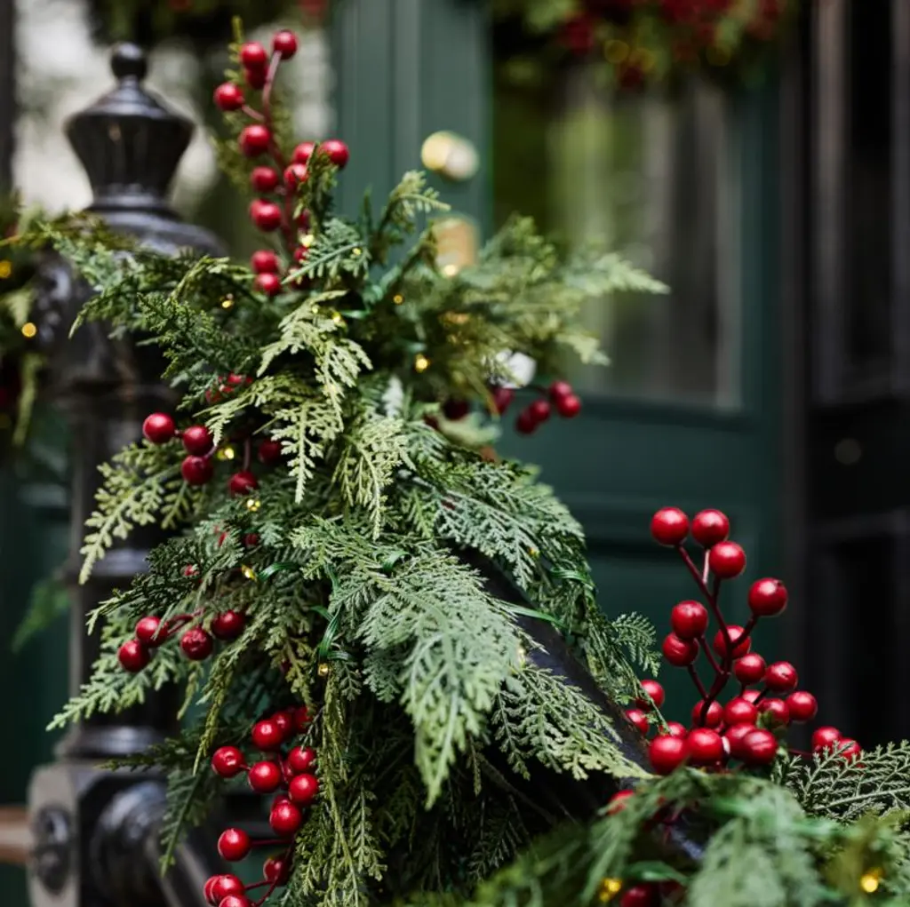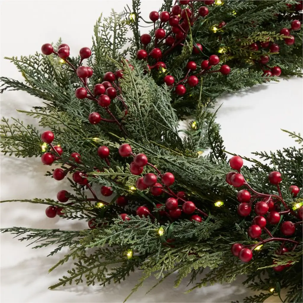 Our pre-lit garland graces the home with the lifelike greenery. Skillfully crafted to look just like real botanicals, the lush swag replicates the soft, feathery appearance of hemlock boughs accented with clusters of red berries. Lit with warm white LED lights, the battery-operated garland looks lovely on a mantel, draped on a banister or running the length of a dining room table.