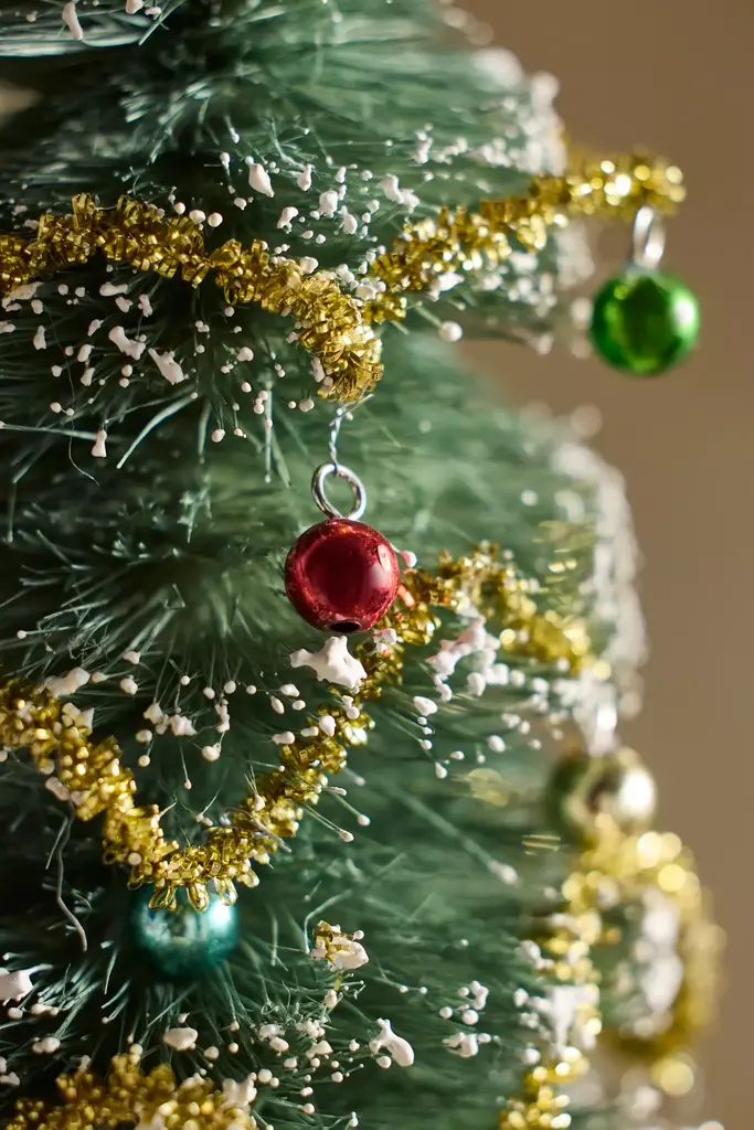 Designed and hand-crafted especially for terrain, this brush tree is a nostalgic accent piece for holiday tablescapes or mantel displays. Each tiny tree is decorated for Christmas with mini baubles, flocking, and a golden garland.