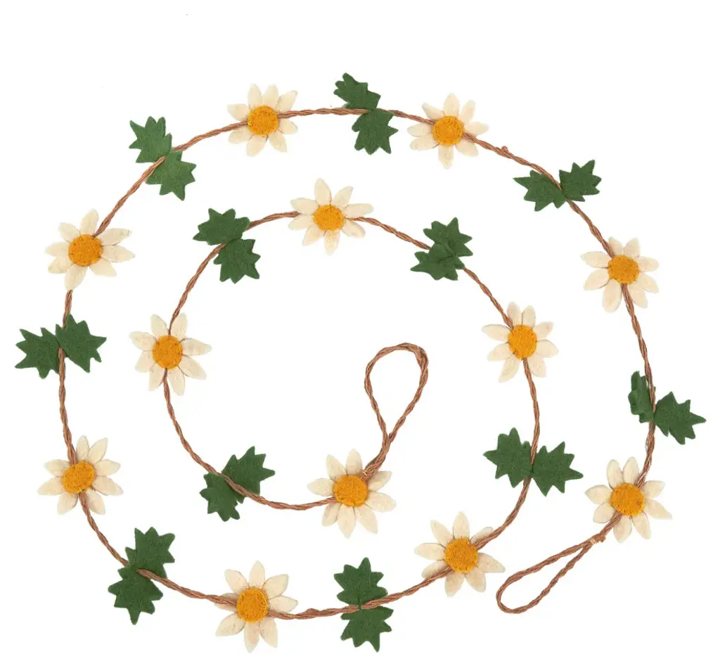 Daisies are one of the most beloved flowers. The daisies and leaves on this garland are handmade of hand felted wool, strung on rustic jute. Use it as part of your Spring decor for a breath of fresh air. Or add to a flower theme for your Christmas tree.Arcadia Home designs are handmade. Each design is as unique as the artisan who creates it. Arcadia Home felt designs are hand-felted, hand appliqued, and lovingly created from 100% sustainable wool by artisans working in India. The facility where these pieces are produced is an award-winning model of sustainability, which runs on solar electricity, collects rainwater, and recycles water on-site. By collaborating with this artisan group, Arcadia Home is helping to preserve the tradition of felt making in the area, promote eco-friendly business, and provide fair and safe employment for hundreds of artisan felt-makers, sheepherders, and seamstresses.Our artisans are experts in their craft - creating the heirloom of tomorrow. Dimensions: 72". As handmade items, size may vary slightly.