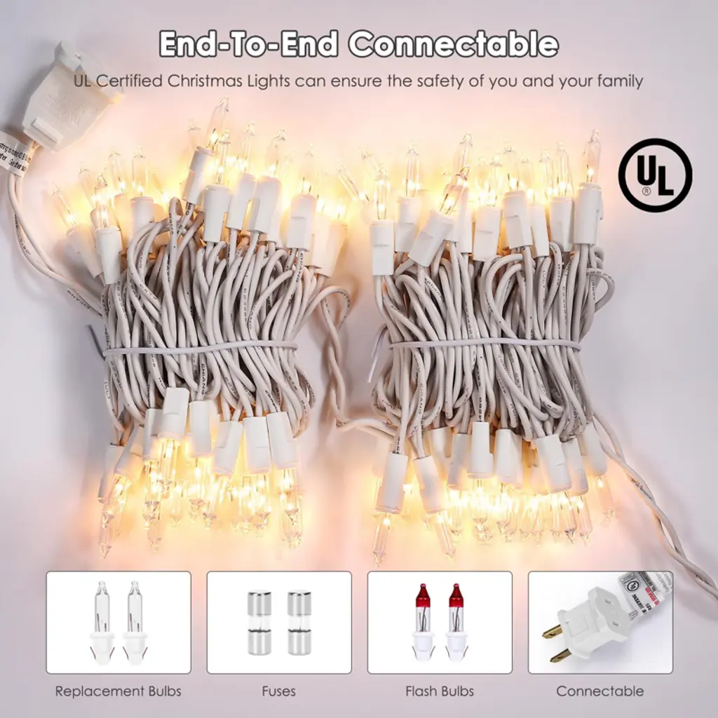 Get ready to transform your space with these Christmas lights! This set of 100 clear white wire string lights is UL - certified, ensuring safety and long - term use. With 100 transparent warm white bulbs on 21 - foot wires, it creates a cozy and festive ambiance. Each bulb is 2.36 inches apart, and the set comes with 2 flasher and 2 extra bulbs for a flash mode. You can connect up to 5 sets, extending the lights up to 105 feet to cover larger areas. The IP44 waterproof design means these lights are suitable for both indoor and outdoor use, with high - quality materials that can withstand all types of weather. Whether it's for your Christmas tree, home, patio, wedding, or party, these lights will surely brighten up any occasion and turn your place into a neighborhood highlight.