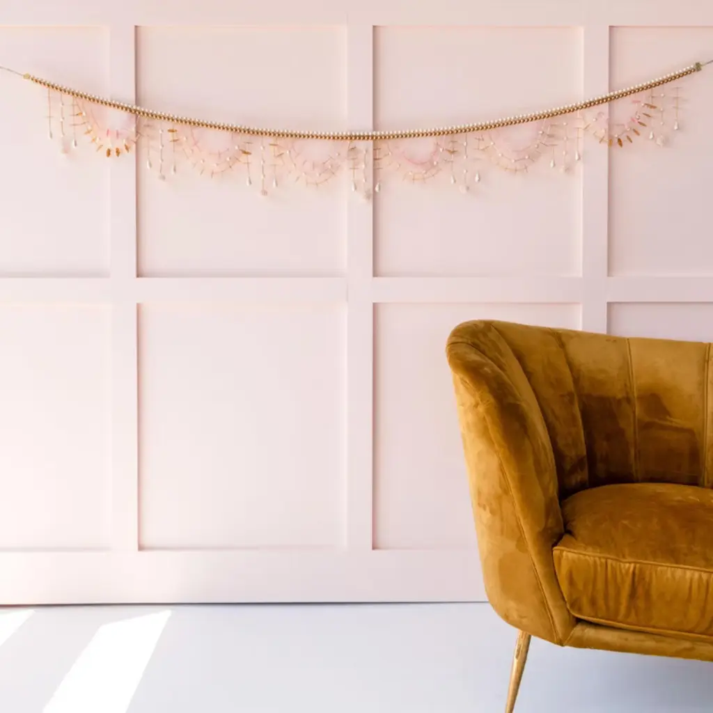 Enhance your celebrations with this versatile and timeless Hanging Pearl Garland. This scalloped garland features pink and gold accents and adds a touch of sophistication to your home decor. Each pearl is delicately strung and complemented by subtle pink highlights for a charming finish. Exquisitely crafted and designed to be used year after year. 1 GarlandEach garland measures approximately 6ft. longHandmade in India