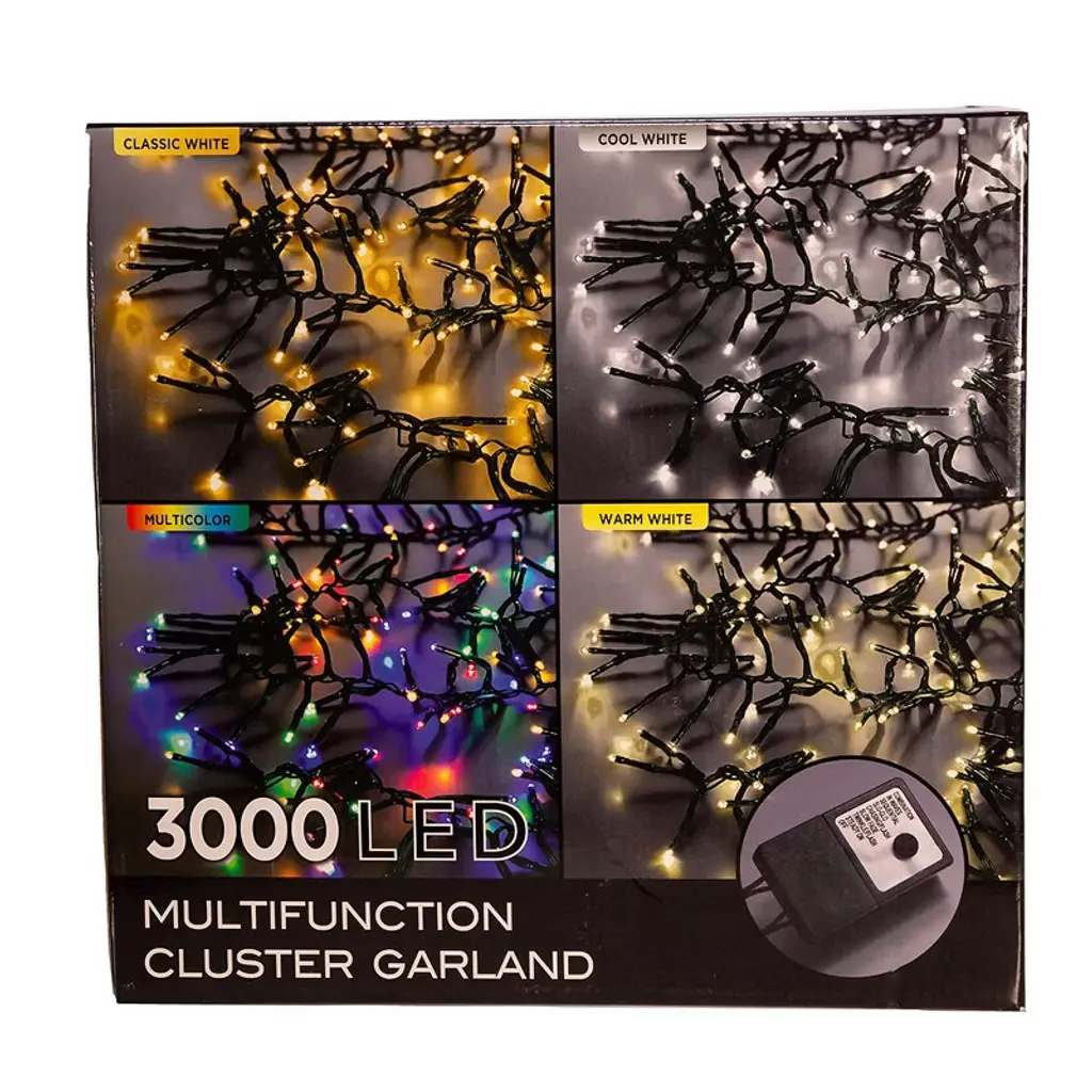 This Kurt Adler 3000-warm white LED cluster lights garland with green wire is a great addition to any lighting décor! With 98-feet of lights this cluster light set will be a modern addition to your home holiday lighting décor. This set features 3000 warm white 3MM LED bulbs with a 8-function remote control.