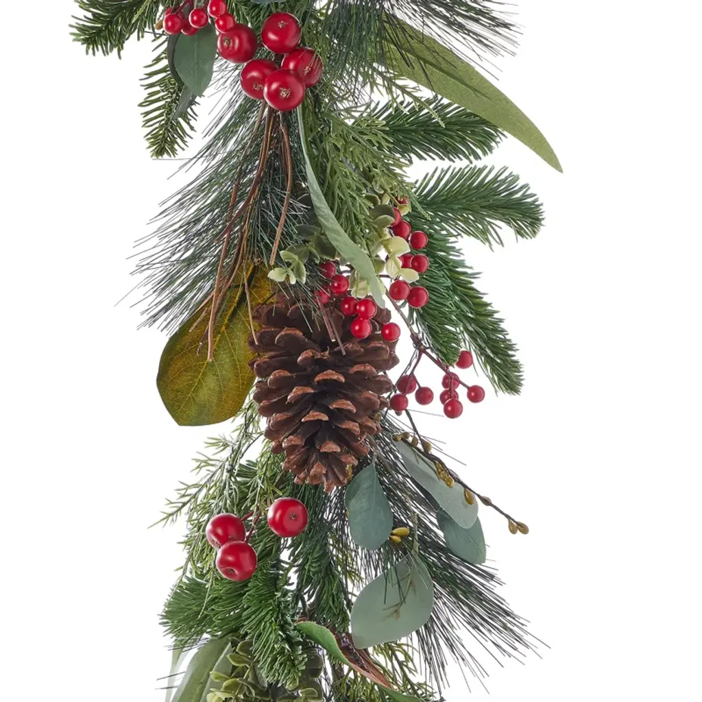 Magnolia Leaf, Eucalyptus, And Berry 9Ft Garland, Pre-Lit With 50 Led Fairy Lights B/o