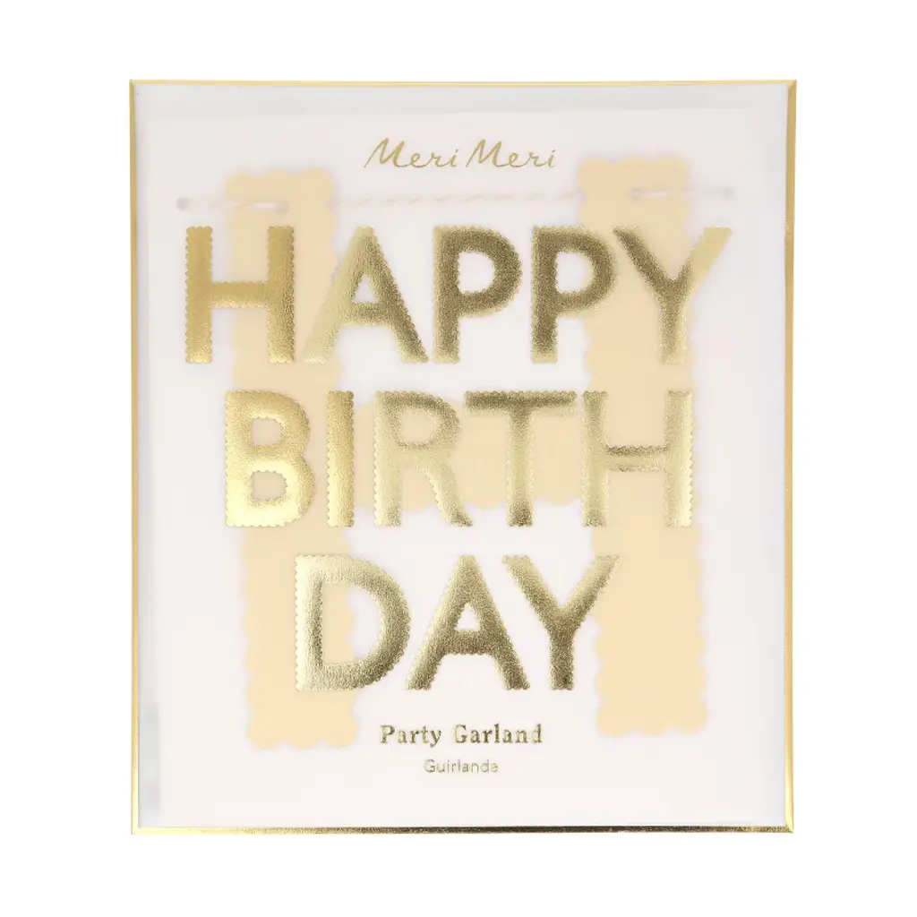 Add a golden glow to your celebrations with this dazzling gold garland, designed to make any birthday feel extra special. Featuring shiny gold foiled letters with elegant scalloped edges, this paper garland is a stylish take on classic happy birthday decorations. Whether draped above a party table, across a wall, over a doorway, porch, or mantel, it creates a striking focal point that captures the joy of the moment. This happy birthday garland adds just the right amount of shimmer and charm, elevating your golden birthday party decorations with a modern twist.
