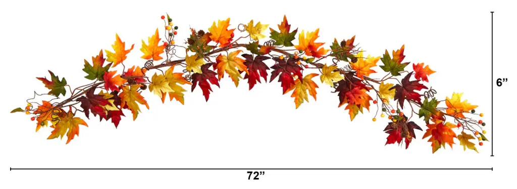Looking for a chic way to get your home fall-ready? Faux for fall colors with this Autumn Maple Berry and Pinecones Artificial Garland. Sparse by design, a palette of fall foliage-inspired maple leaves sit on a thin branch, accented by faux berries bring texture and color. For a vivid touch, add to your bed frame, mantel or tablespace. With a length of 6 display during Thanksgiving. 6 Autumn Maple Leaf and Berry Fall Garland