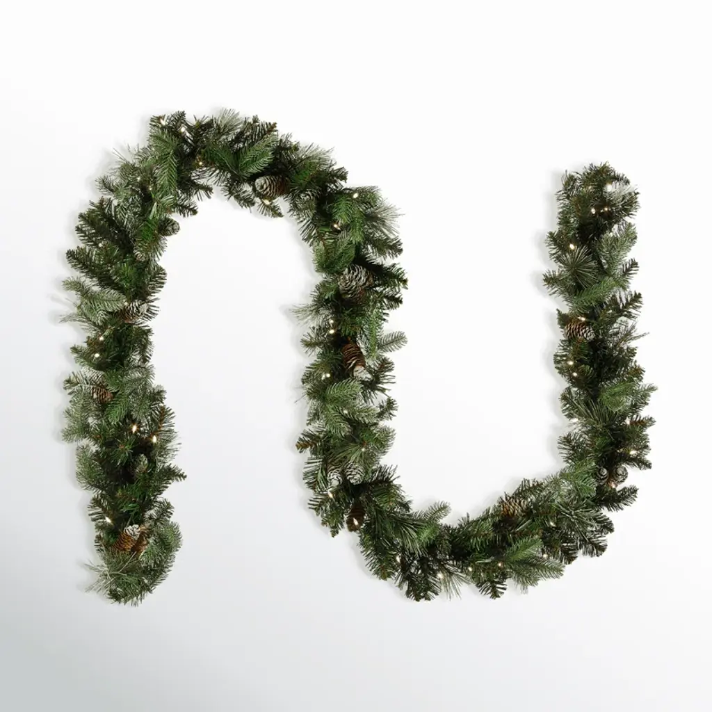 Garland is beautifully accented with a lush mix of foliage. Longer (3" wide) needle pine tips have two-tone green color which are mixed with shorter (1.5" wide) light green tips for extra dimension and real beautyProduct Features:Pre-lit with 100 warm white LED lights"Warm white" also known as "warm clear" has a nice natural warm incandescent candle like glowBulb size: mini290 tipsAccented with pine cones throughoutBendable wire center allows for you to shape the garland any way you desireGreen metal hooks on each end for easy hangingAdditional Product Features:LED lights use 90% less energyDurable non-glass replaceable bulbsCool to the touchIf one bulb burns out the rest will stay litUL listed for indoor or outdoor useContains end-to-end connectors which allows you to connect multiple garlands together (not to exceed 210 watts)Comes with replacement bulbs and spare fusesWire gauge: 22Dimensions: 9'' long x 16" wideMaterial(s): PVC/pine cones/plastic bulbs/wire/metal
