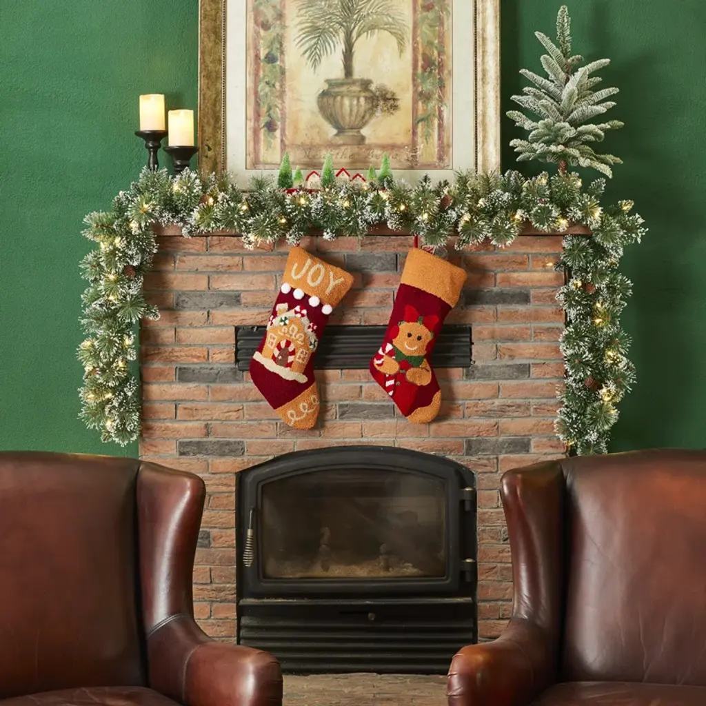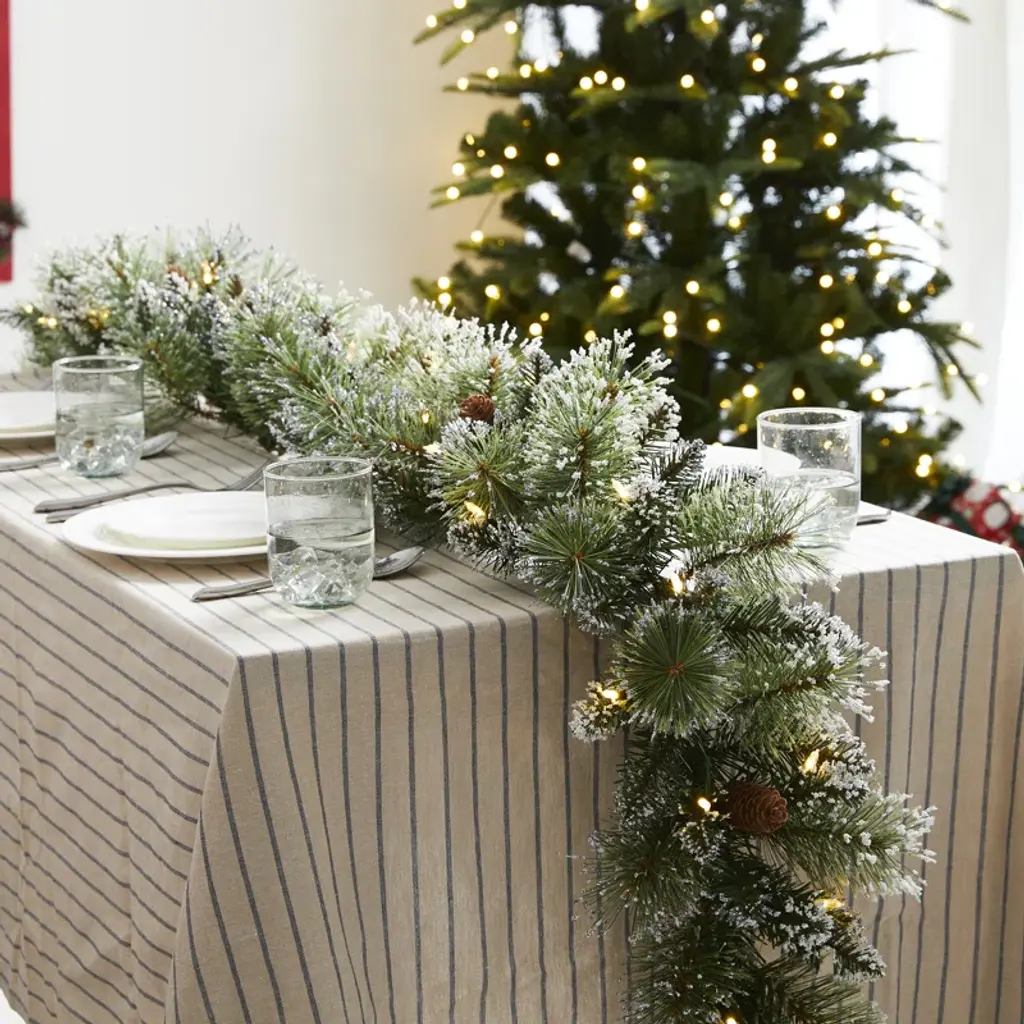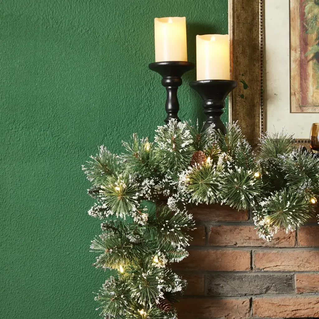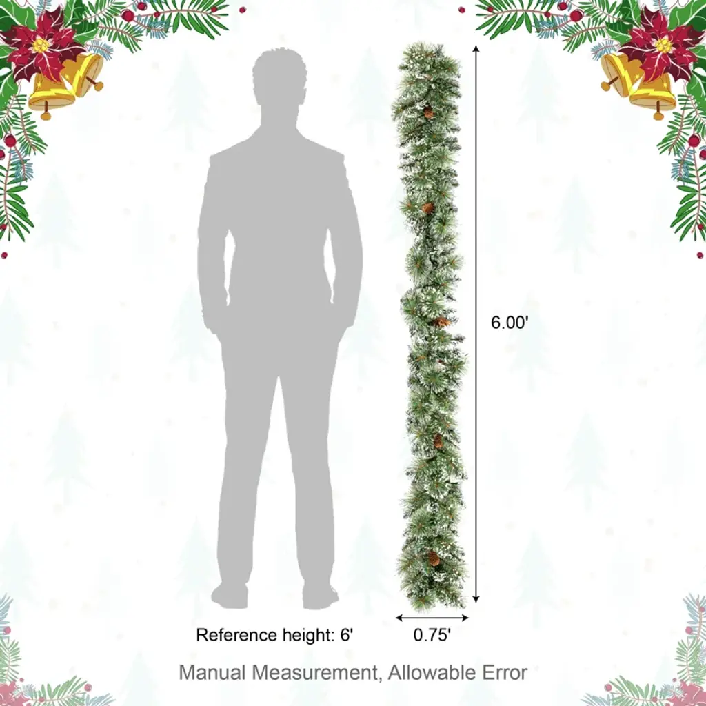 This set of pre-lit garland features a beautifully decorated arrangement of greenery, pinecones, and frosted detailing, adding a touch of elegance and festive charm to any space.
