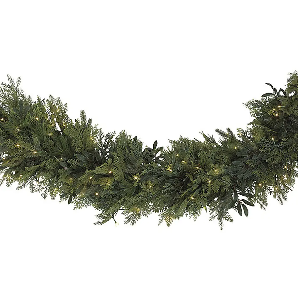 Extra full and thick, our classic Prelit Mixed Cedar 6-foot Garland is handmade with 210 tips of faux cedar mixed with sprays of hardneedle and olive leaves for lush texture and layered color. Branches are pre-lit with 70 warm white, battery-powered LED micro lights controlled with a timer. Prelit Mixed Cedar Holiday Garland features: