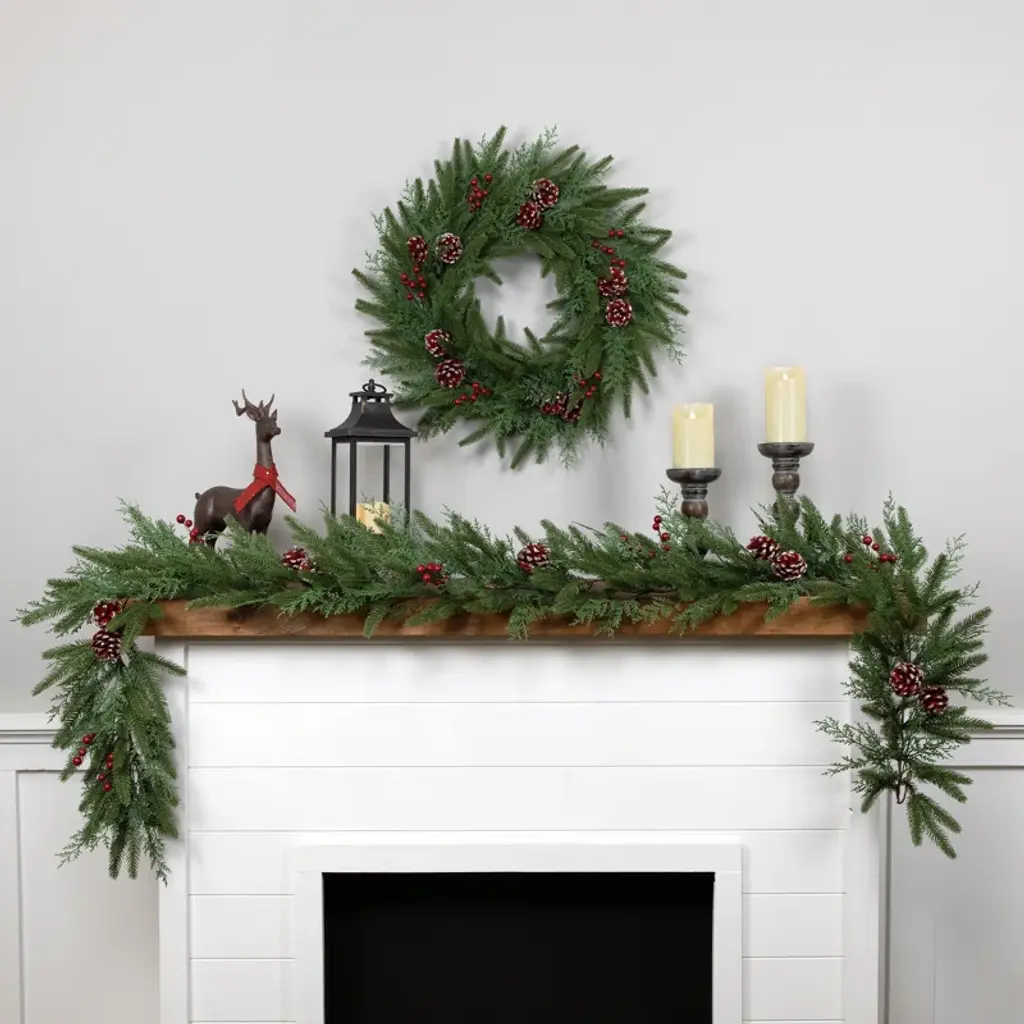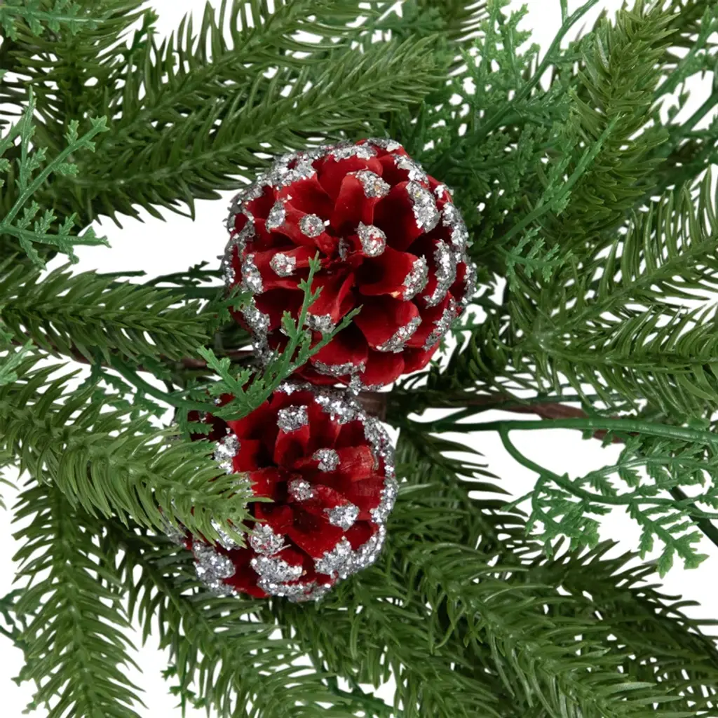For the most realistic artificial Christmas garlands around choose Northlight Real Touch artificial Christmas garlands. Add some Christmas magic to your holiday decor with our Wind River fir garland. This lush garland features red pinecones with glitter accents and vibrant red berries creating a cheerful and inviting atmosphere in any space. Perfect for mantels staircases and doorways this garland brings the beauty of the season indoors. Hooks on each end for easy hanging. The bendable wire center allows you to shape the garland any way you desire. Recommended for indoor use - if using outdoors place under a covered area.