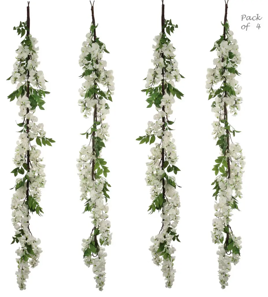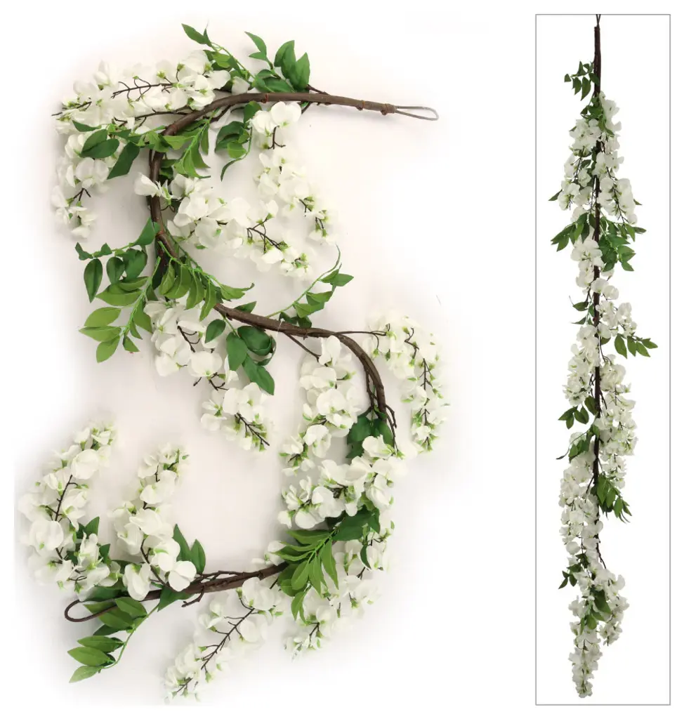 This gorgeous 60" White Life-like Wisteria Garland with 12 Perfectly Designed Hanging Flowers looks so real your guests will simply assume it is! The color of the flowers, the realism of the foliage and the overall feel of the garland itself lacks little in comparison to that of nature.Great for Weddings, Trellises, Railings, mantels, Home, Office, lobby or Party Space Use this garland will make your DIY projects look as though a professional did it!Decorative containers are sold separately.