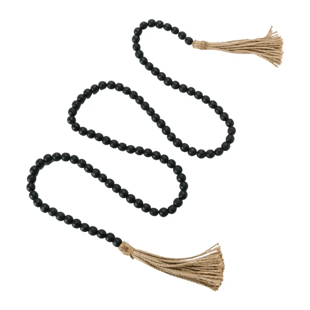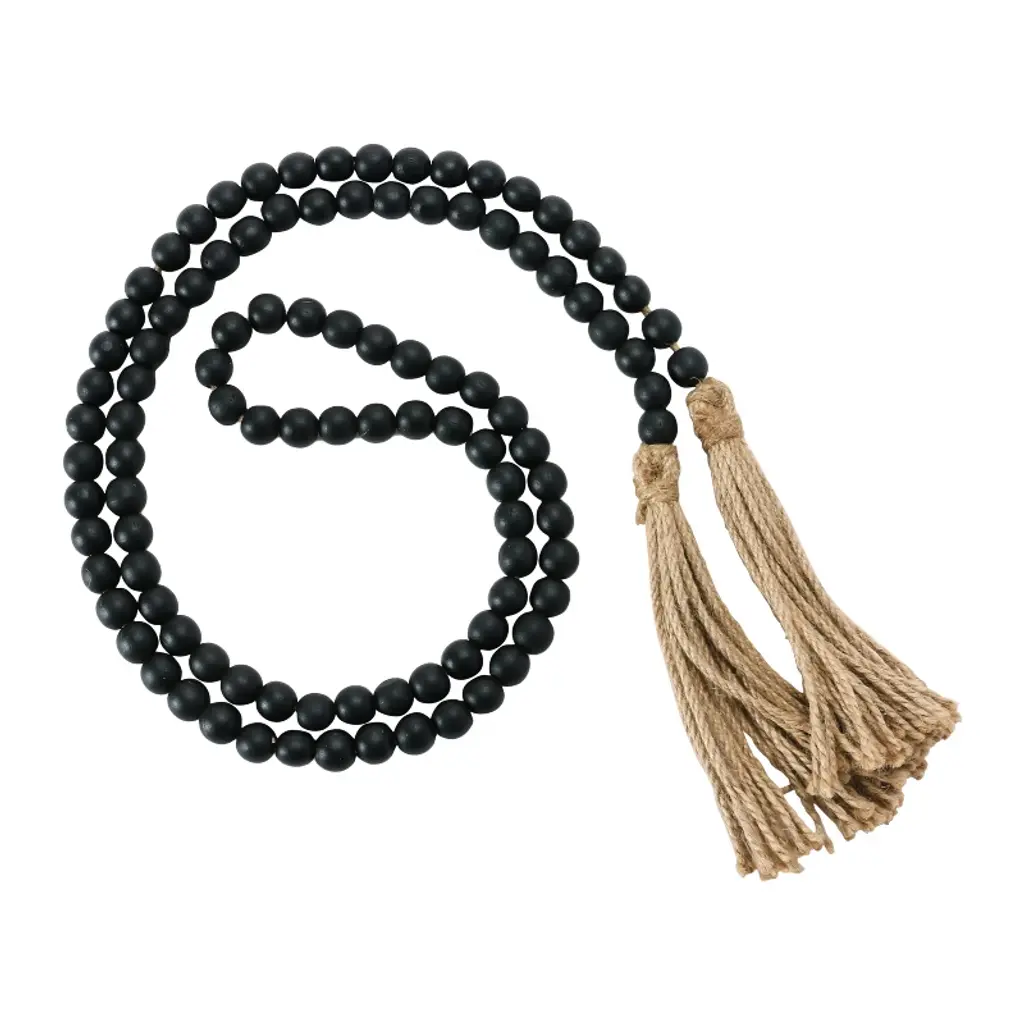 Storied Home Paulownia Wood Bead Garland With Jute Tassels, Distressed Black