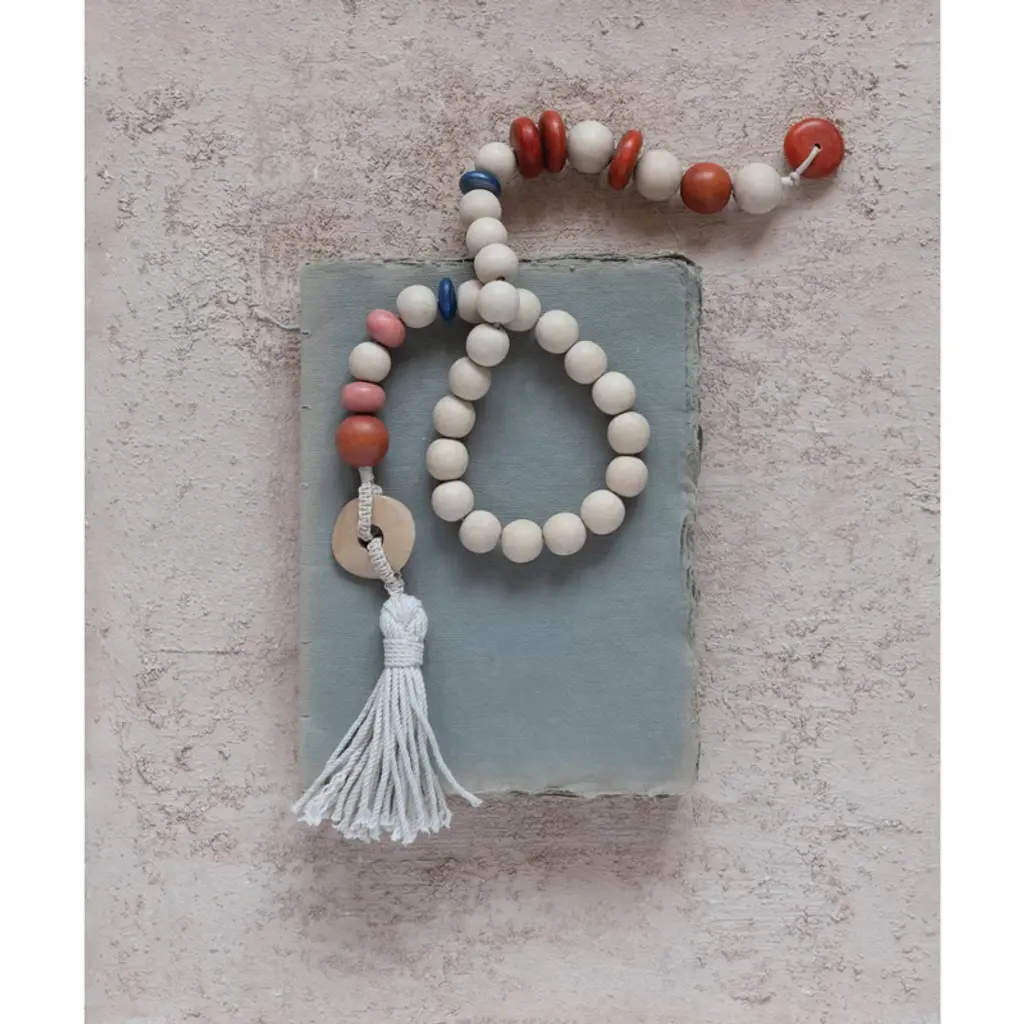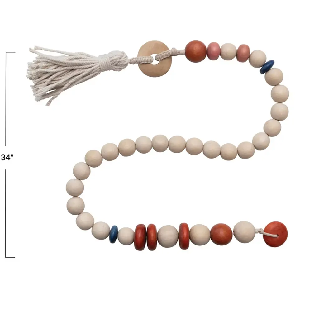 Multicolor wood bead garland with natural cotton tassel; Artfully display this decorative garland as a part of a mantel display, or add a touch of whimsy to any room; Made from gmelina wood and cotton; Garland measures 34" L x 1" W x 2" H