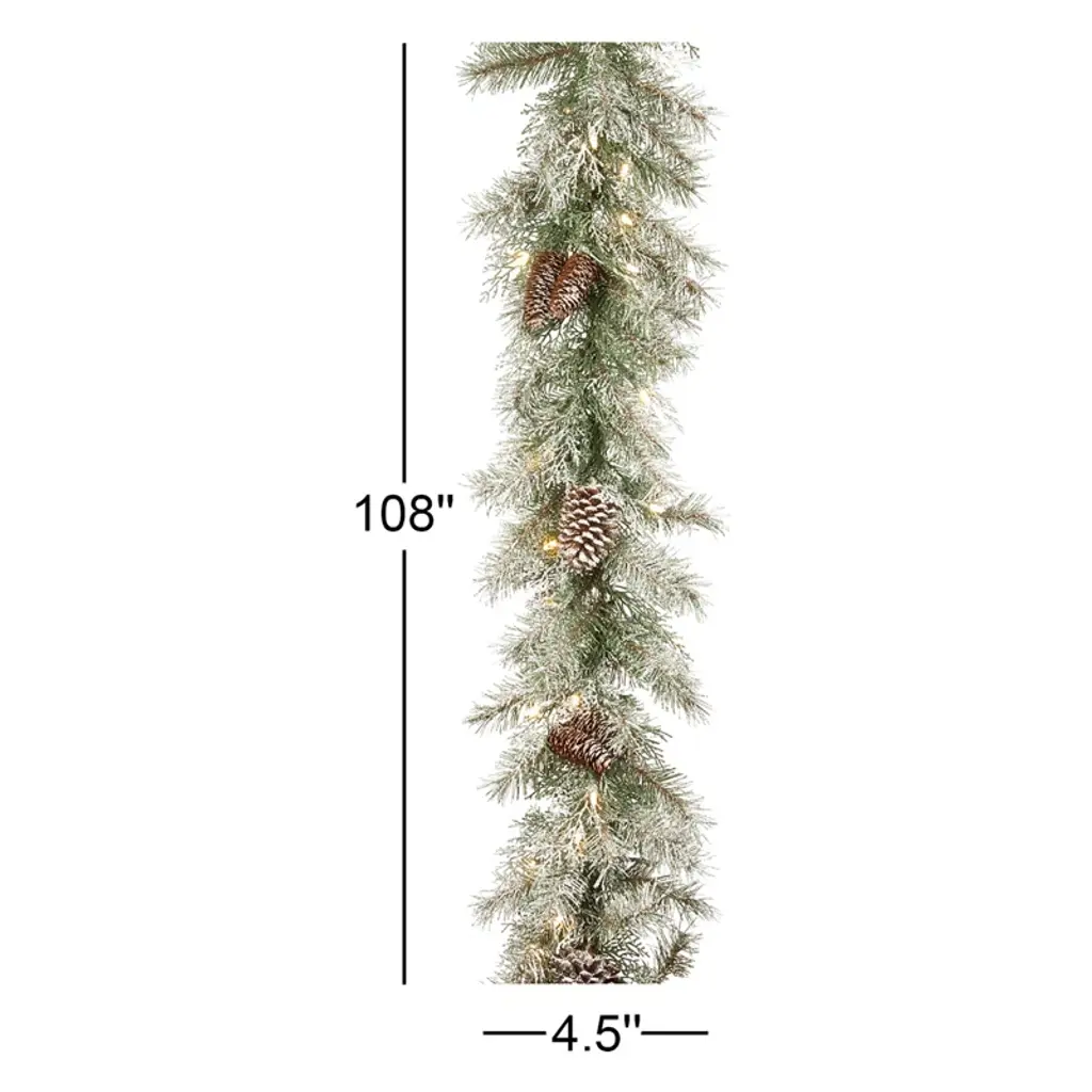 The Frosted Mountain Spruce Garland features feel real branch tip technology, creating a decoration with remarkable realism. This decoration has snow-sprinkled branches and is trimmed with pine cones. It is pre-strung with 50 clear lights that remain lit even if a bulb burns out. This indoor/outdoor garland can be displayed over doors, windows, fireplace mantels, fence, or stairway railings.