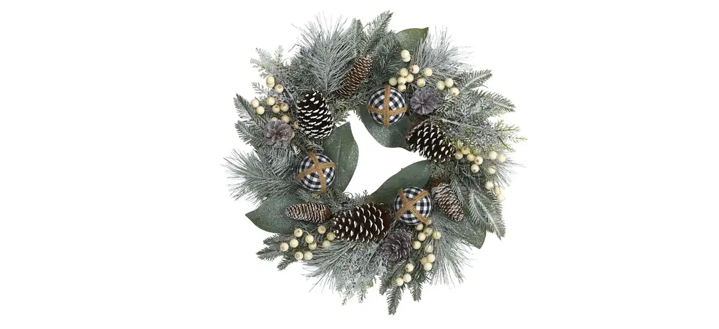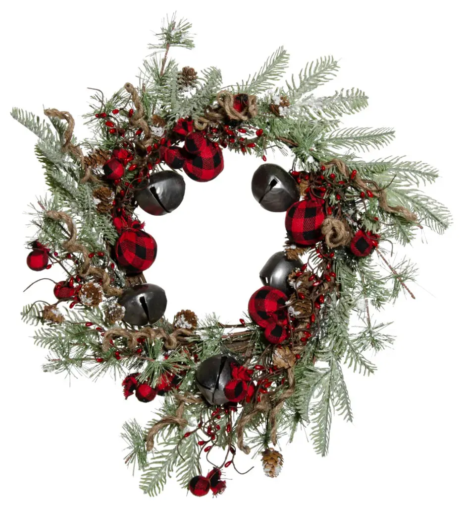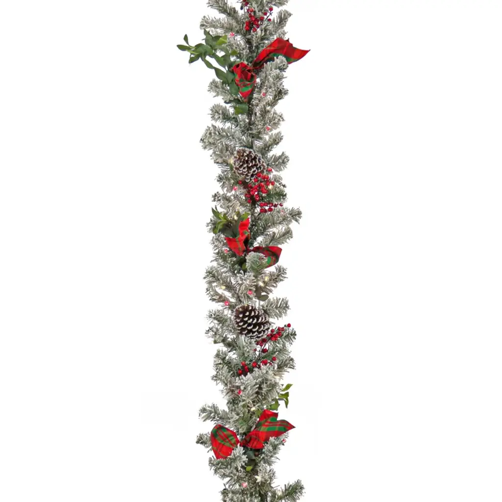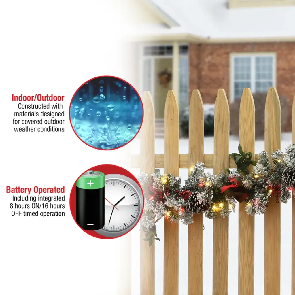 This holiday garland features snow-sprinkled evergreen branches flowing along a flexible vine base, trimmed with pinecones, red berries, and plaid fabric bows. It is pre-strung with 75 battery-operated warm white LED lights that are energy-efficient and long-lasting. Included is an option for 6 hours on/18 hours off-timed operation. Also included is a convenient handheld remote to control the lights. This indoor/outdoor garland can be displayed over doors, windows, fireplace mantels, fences, or stairway railings.