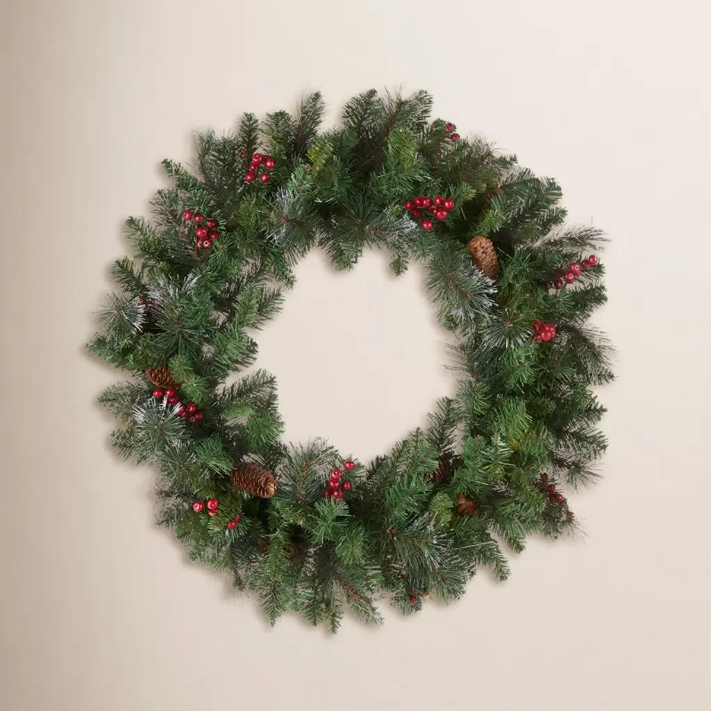 This Glistening Pine garland features mixed branch tips and is trimmed with red berries and pinecones for added natural appeal. It is pre-strung with 50 clear lights that remain lit even if a bulb burns out. This indoor/outdoor garland can be displayed over door, window, fireplace mantel, fence, or stairway railings.